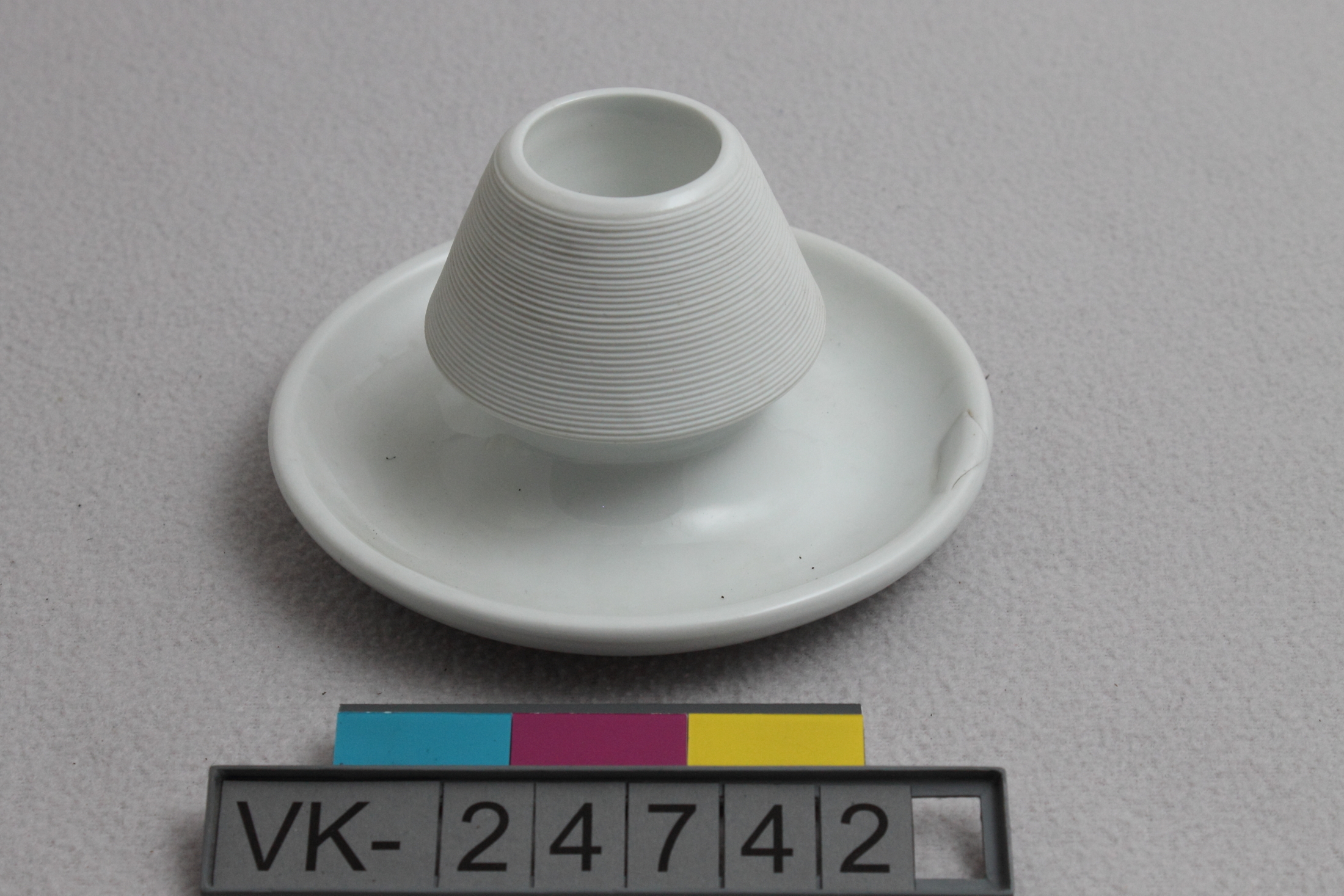 Kerzenständer für eine Kerze aus weißem Porzellan. Der Kerzenständer besteht aus einem Teller mit einem darauf stehenden, konischen, gerillt profilierten Element.