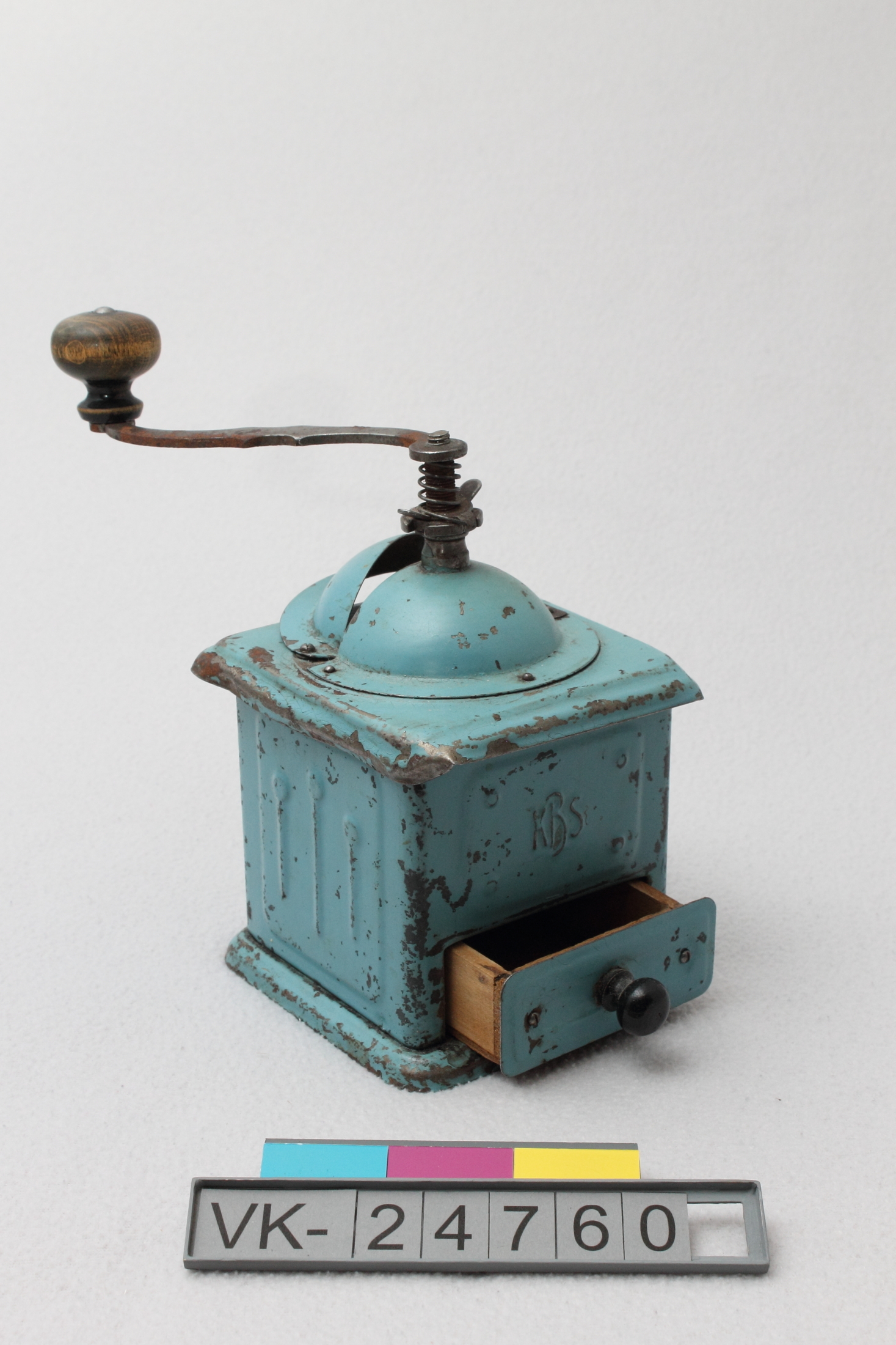 Hellblau lackierte Kaffeemühle mit Kurbel und einer kleinen Lade; die Mühle hat eine eingepresste Beschriftung: "KBS".
