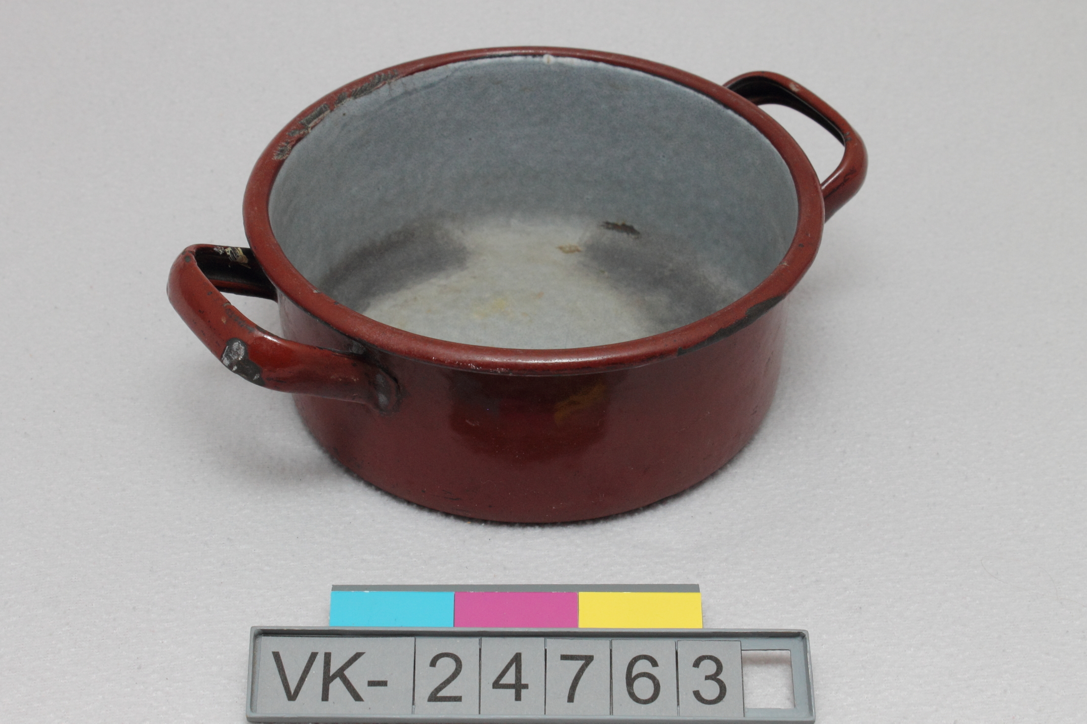 Kleiner Kochtopf mit zwei Griffen, außen weinrot und innen grau emailliert, mit Beschriftung am Boden: "Austria Email".