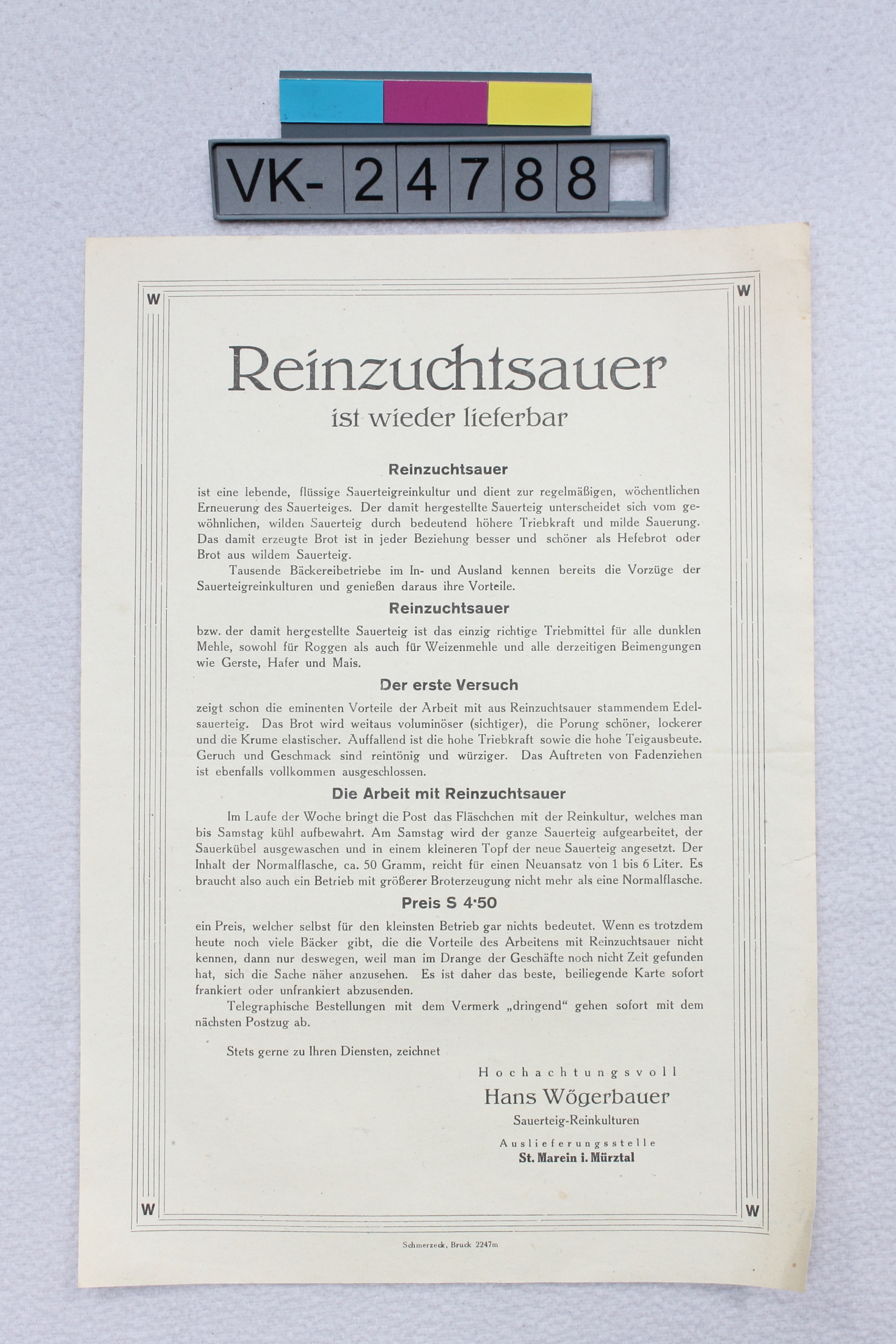 Werbeprospekt in schwarz-weiß: Werbung für Sauerteig der Firma Hans Wögerbauer. Auf der Rückseite diverse handschrifltliche Notizen.