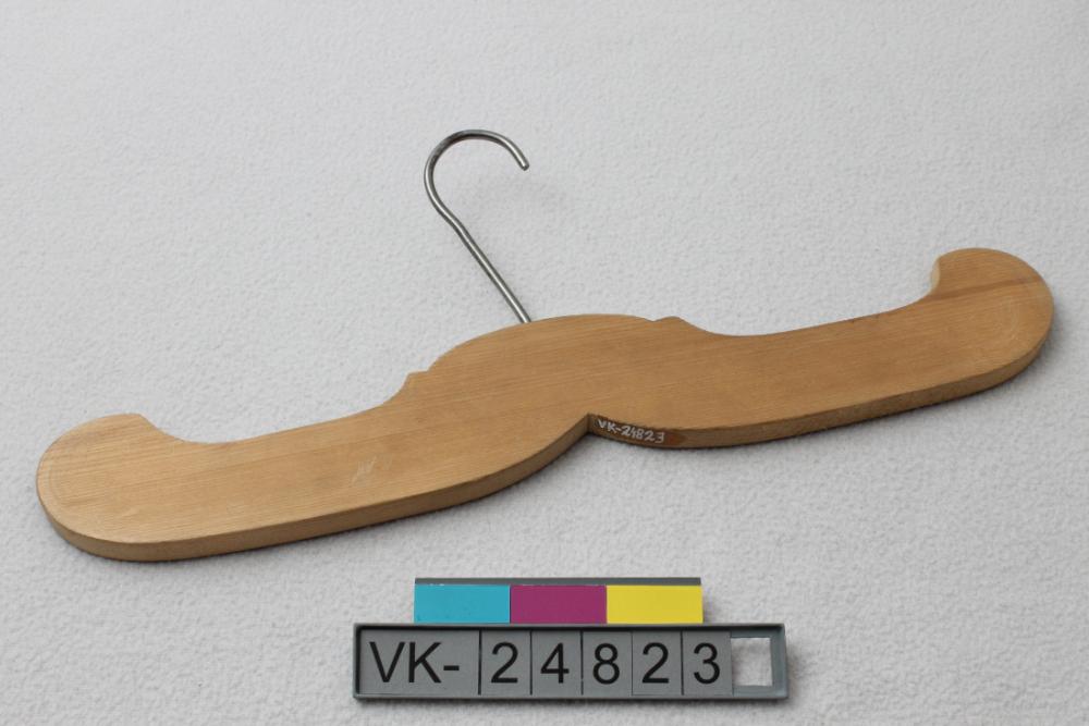 Flacher Kleiderbügel aus Holz mit einem Drahthaken. Der Kleiderbügel ist geschweift ausgeschnitten.