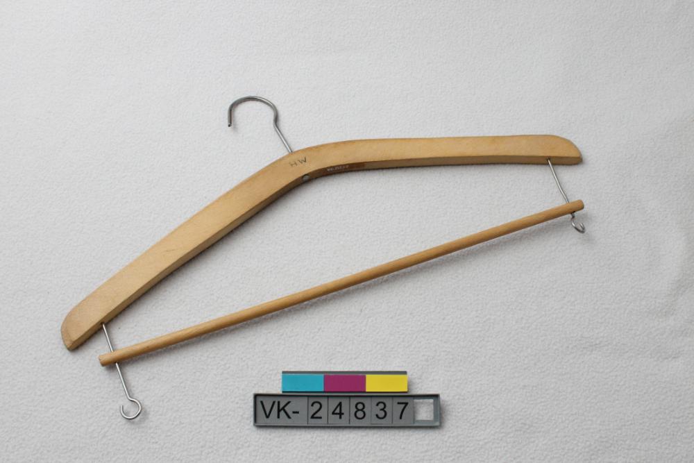 Flacher schmaler Holzkleiderbügel mit einem Haken und zwei von unten eingesetzen Rockhaken, an denen ein Hosensteg befestigt ist. Der Kleiderbügel ist beschriftet: "HW".