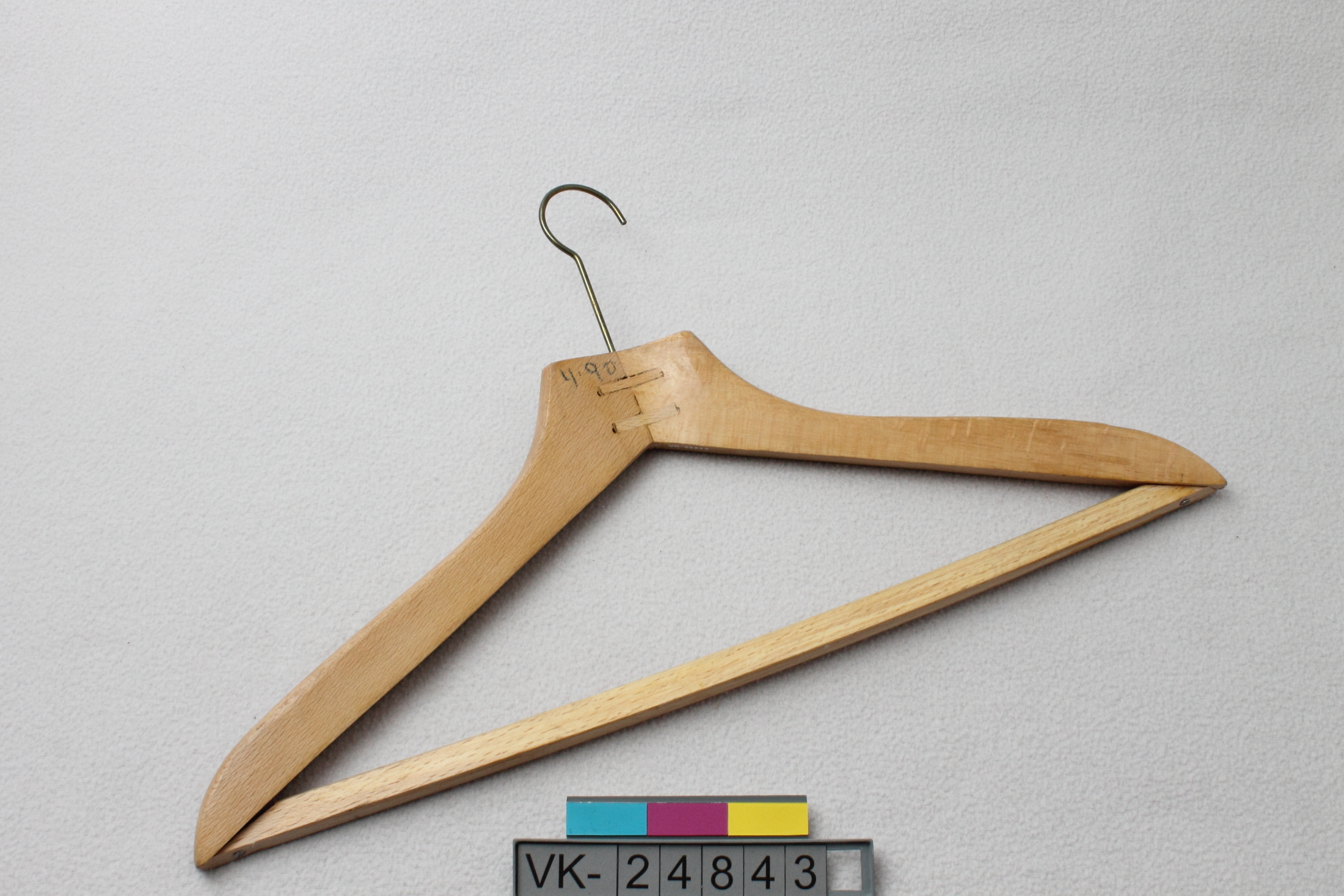 Holzkleiderbügel (Formbügel) mit Metallhaken und Hosensteg. Der Kleiderbügel hat eine handschriftliche Preisauszeichnung: "4,90".