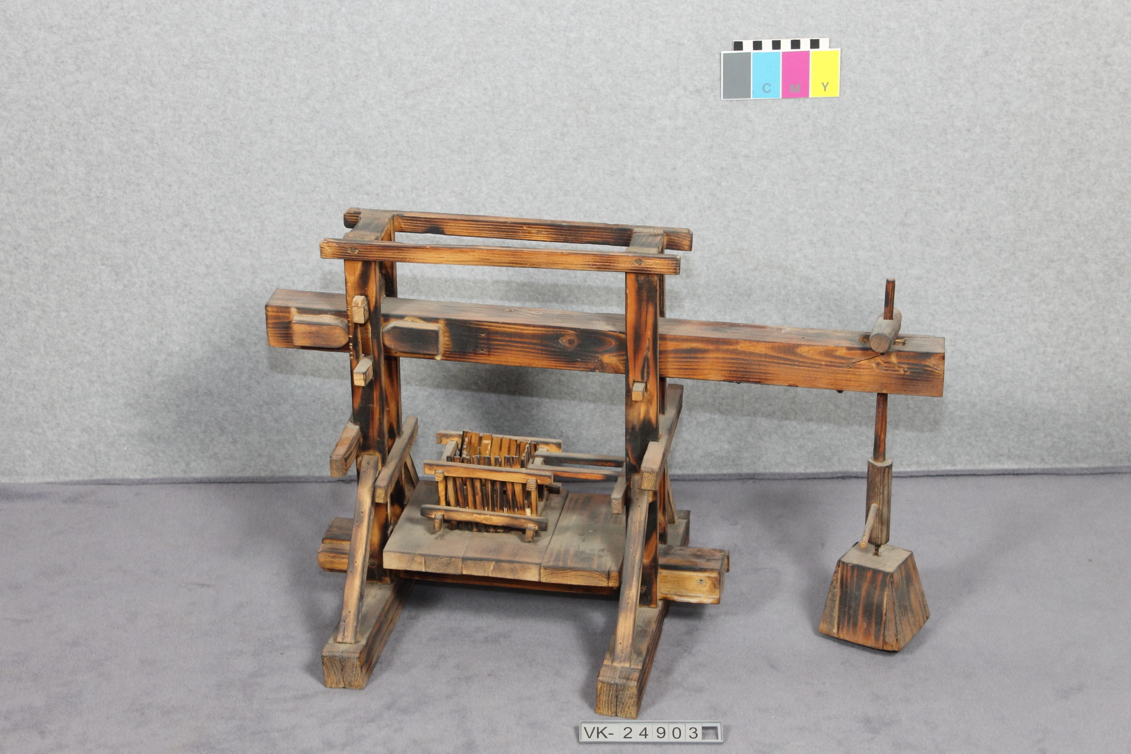 Modell einer Baumpresse, aus Holz hergestellt, ausgestattet mit einem rechteckigen Presskorb und einem trapezförmigen Gewicht. Die gesamte Oberfläche ist geflämmt.