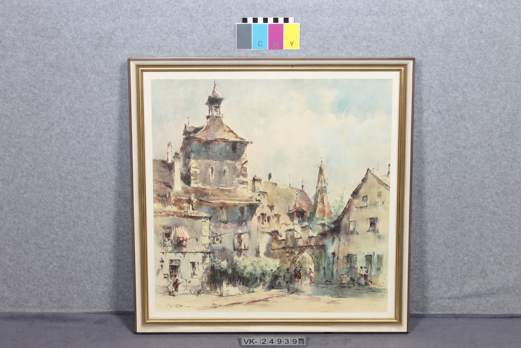 Druck eines Aquarells in einem teilweise vergoldeten Holzrahmen hinter Glas: Stadtansicht mit einem Stadttor.