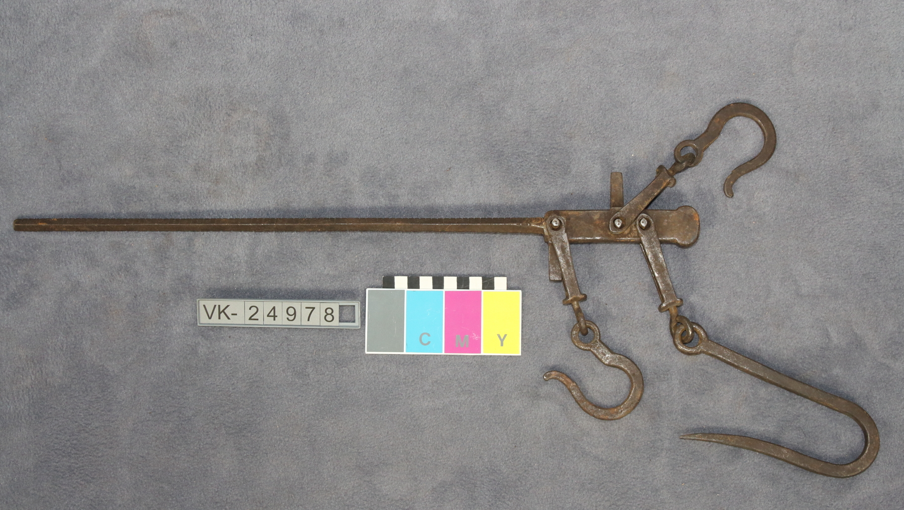 Schmiedeeiserne Laufgewichtswaage mit gezahnter Kante und eingeschlagener Skala; die Waage hat zwei kleine und einen großen Eisenhaken.