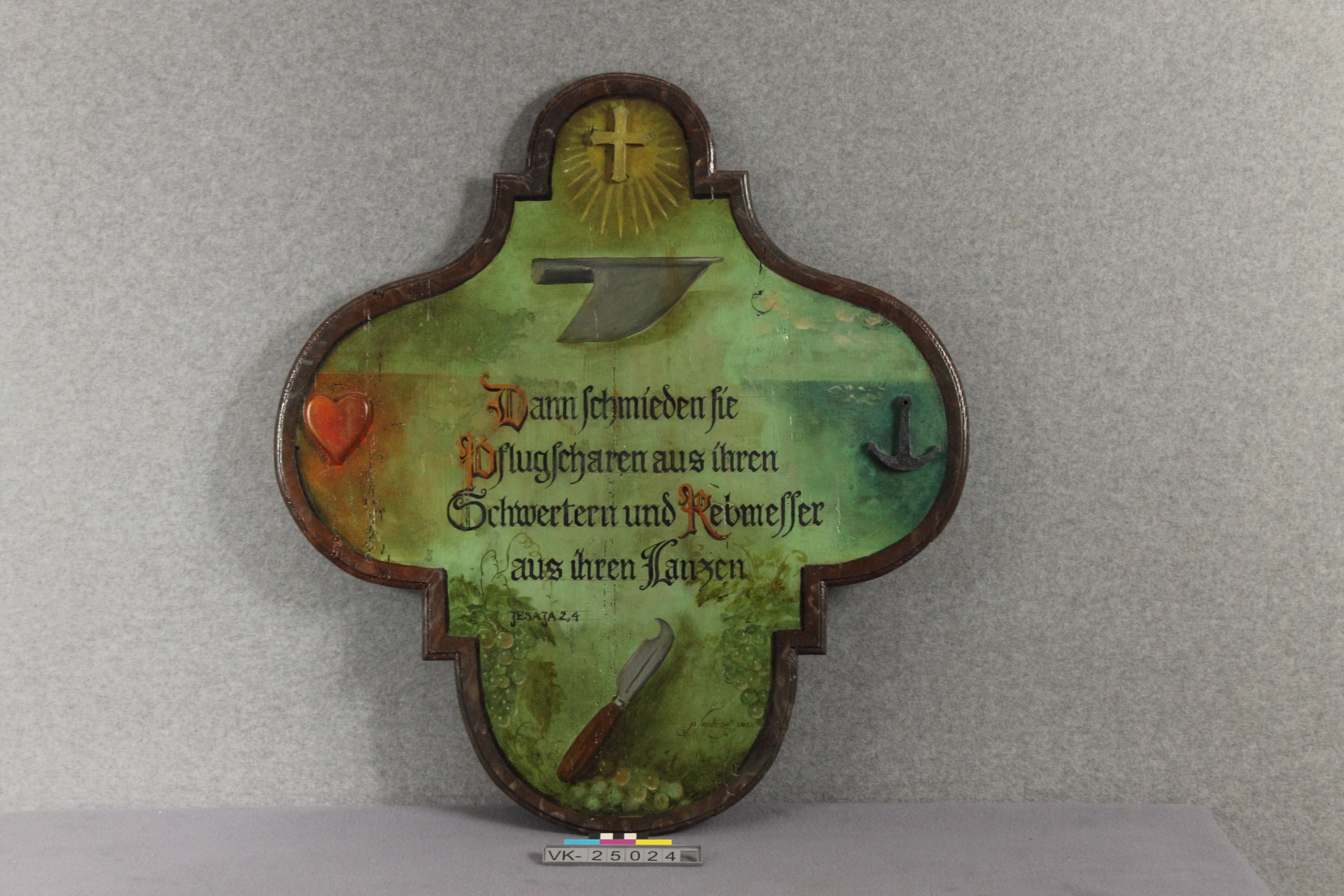 Annähernd vierpassförmiges Holzschild, bemalt mit Pflugschar und Rebmesser, dazu Trauben. Als Applikationen sind ein Kreuz, ein Herz und ein Anker angebracht. Text: Dann schmieden sie Pflugscharen aus ihren Schwertern und Rebmesser aus ihren Lanzen JESAJA 2.4".