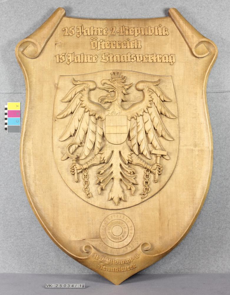 Hölzernes geschnitzes Wappen mit Relief des Österreichischen Staatswappens, dazu eine Beschriftung: "25 Jahre 2. Republik 15 Jahre Staatsvertrag". Das Wappen wurde vom NÖ Bildungs- und Heimatwerk übergeben, dazu wurde ein Gedenkschießen veranstaltet. Informationen dazu finden sich auf verklebten Zetteln auf der Rückseite des Wappens.