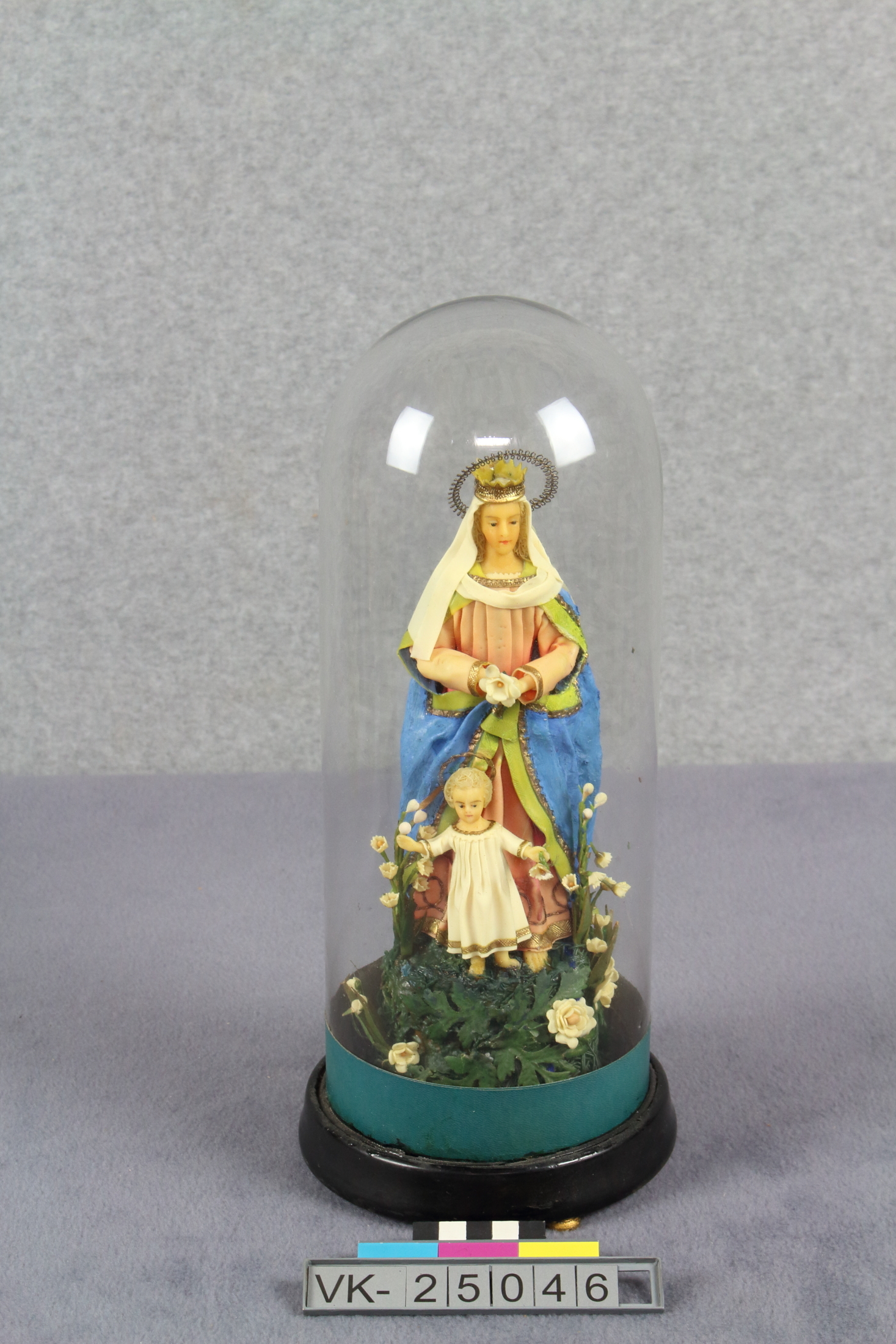 Glassturz mit schwarzem Holzsockel mit kleinen goldfarbenen Füßen, darin eine Wachsfigur aus dünnen Wachsplatten in mehreren Farben auf einem Sockel: Maria mit Jesuskind. Am Fuß des Glases ist grünes Textilklebeband verklebt.