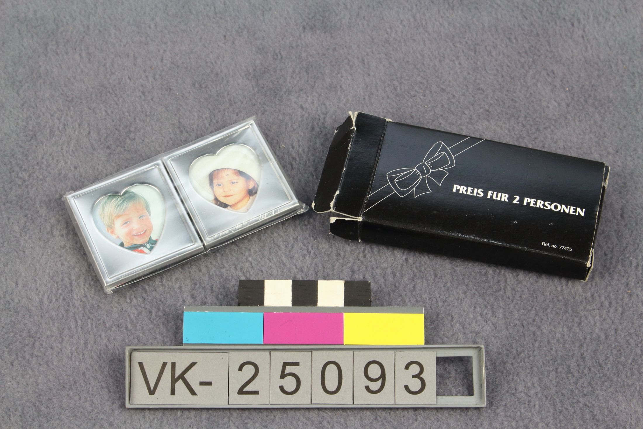 Kleiner Doppelbilderrahmen mit herzförmigen Ausschnitten in einer Plastikfolie und einer schwarzen Kartonschachtel mit Aufdruck: "PREIS FÜR ZWEI PERSONEN". Das Objekt befindet sich in der Schatulle mit der Inventarnummer VK-24882.