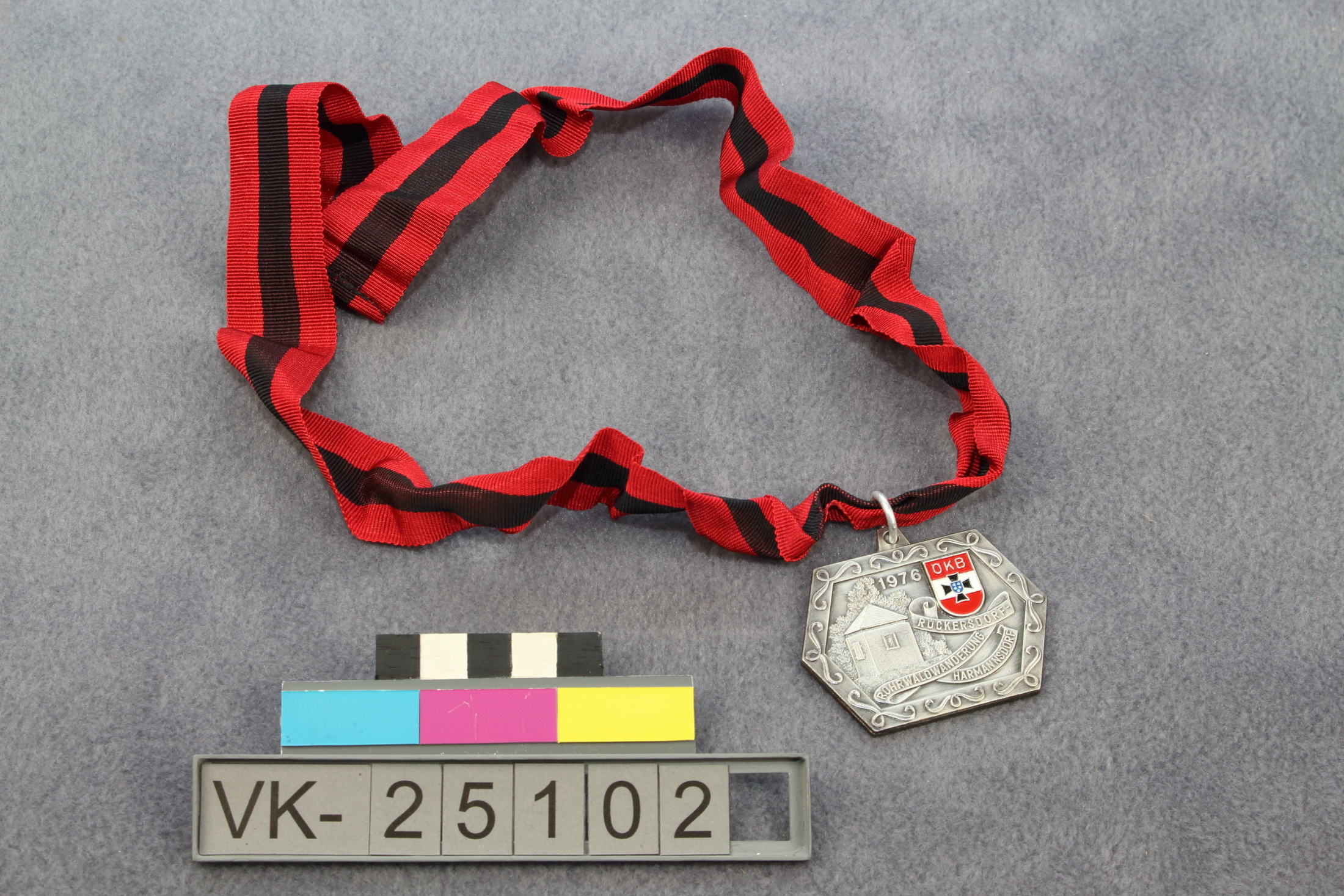 Sechseckige Erinnerungsmedaille mit Halbrelief und Emaillierung (Gebäudeansicht, Wappen des ÖKB, "1976 RÜCKERSDORF ROHRWALDWANDERUNG HARMANNDORF") an einem rot-schwarz-roten Ripsband. Das Objekt befindet sich in der Keksdose mit der Inventarnummer VK-25120.