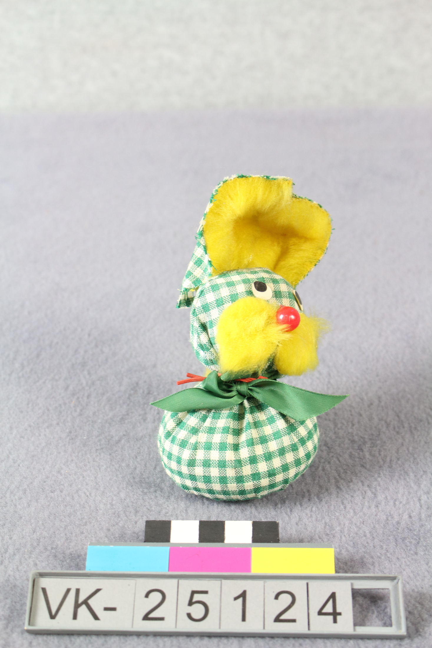 Hasenfigur aus einem zu zwei Kugeln gebundenen grün-weiß karierten Tuch, beklebt mit gelbem Plüsch. Auf dem Boden ist ein Aufkleber "HASLINGER WIEN...". Möglicherweise enthält die Figur essbare Bestandteile oder eine Seife.