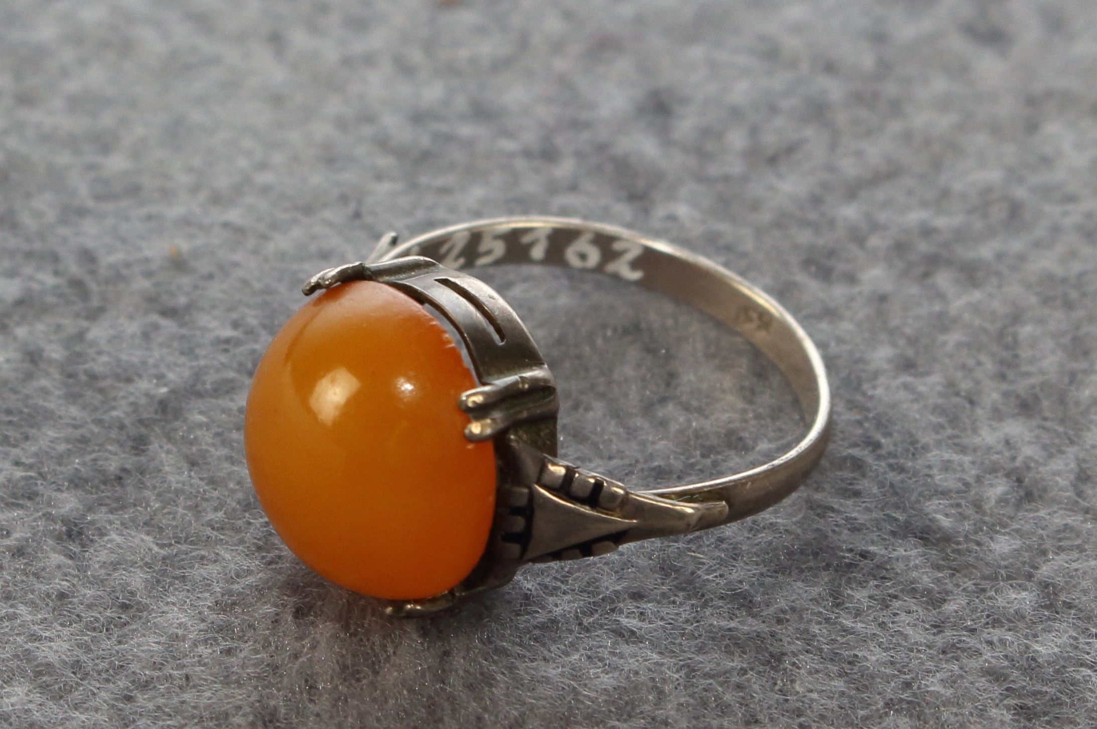 Silberner Ring mit einem halbrunden, gefassten, orangen Halbedelstein. Das Objekt befindet sich in der Schatulle mit der Inventarnummer VK-25149.