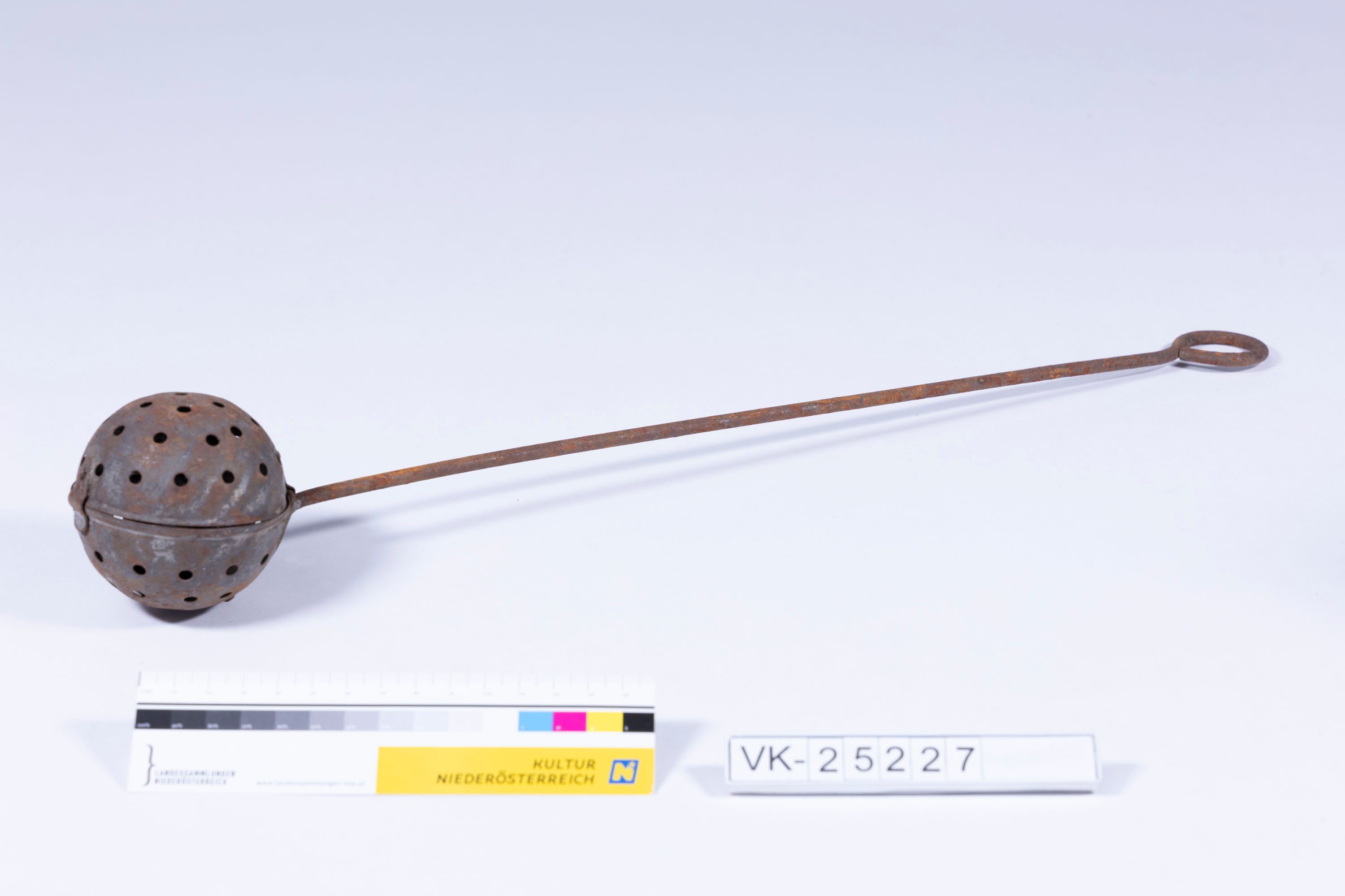 Schneeballform aus verzinktem Blech, bestehend aus zwei gelochten Halbkugelschalen und einem langen Stiel mit Öse.
