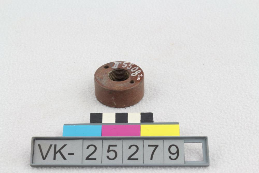 Holzmutter mit Innengewinde und zwei Bohrungen.