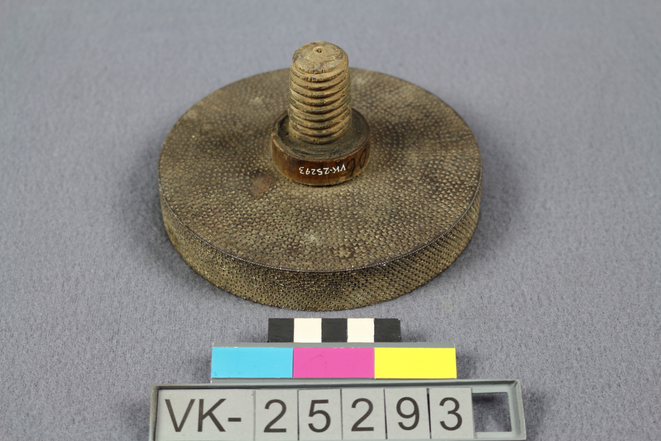 Schleifscheibe (Raspel) aus Eisen mit einer Holzachse mit Gewinde zur Aufnahme.