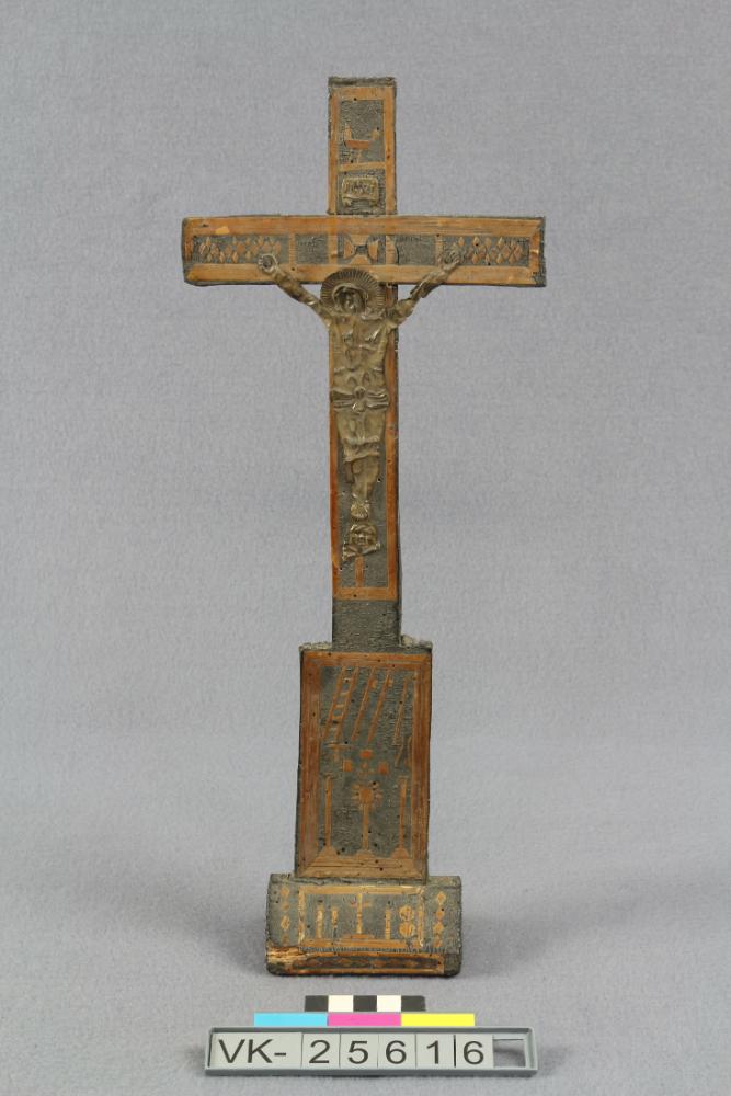 Kruzifix mit schwarzem Kreuz mit Sockel, darauf Strohapplikationen (Leidenswerkzeuge), Korpus aus Messing getrieben.