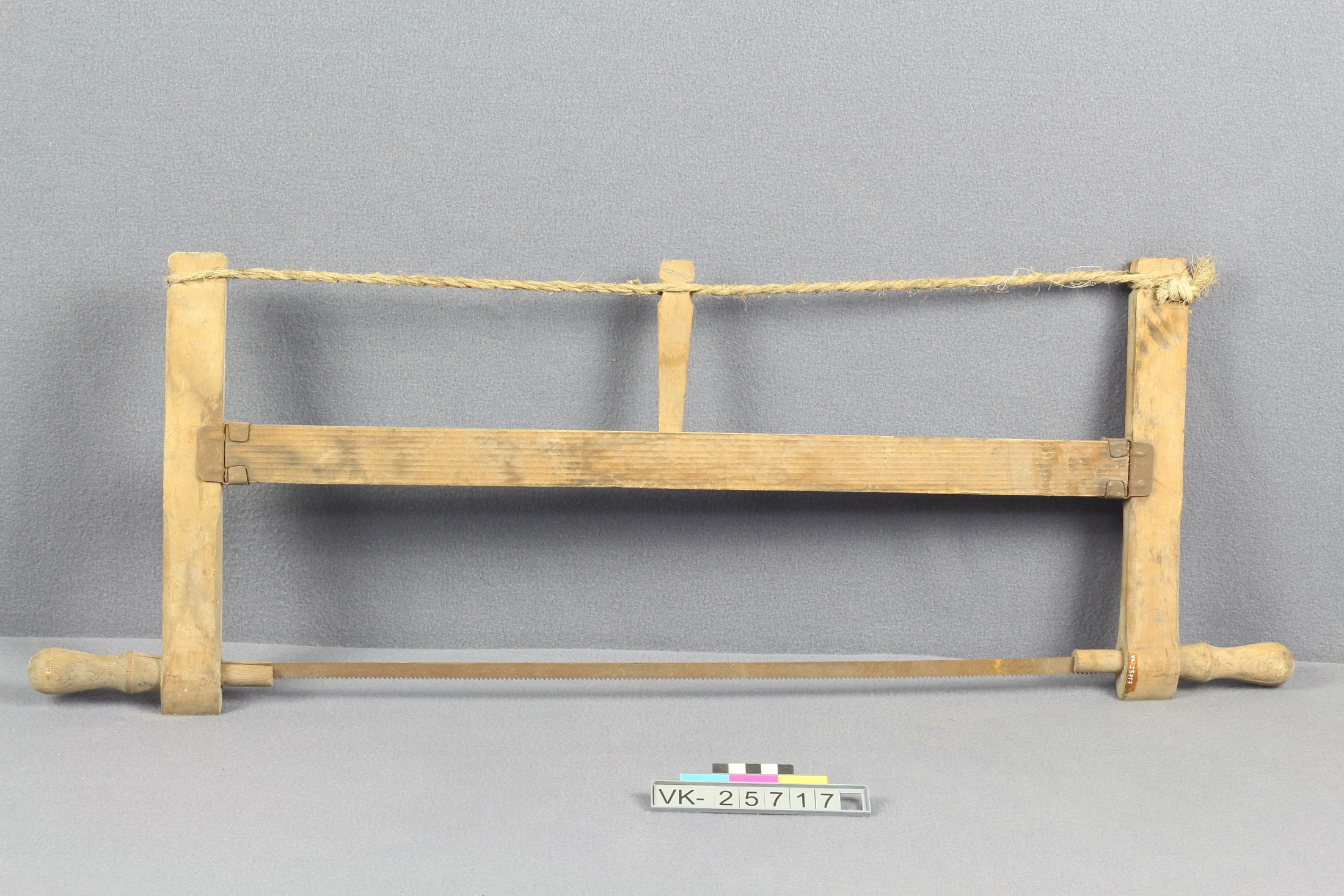 Spannsäge mit Rahmen, Griffen und Sägeblatt; gespannt über eine gedrehte Schnur mit Klemmkeil.
