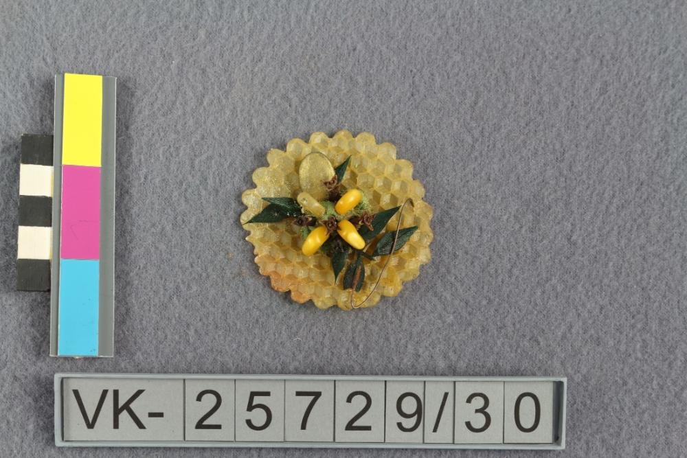 Zierelement aus Bienenwachsplatte mit Gewürznelken und Maiskörnern.