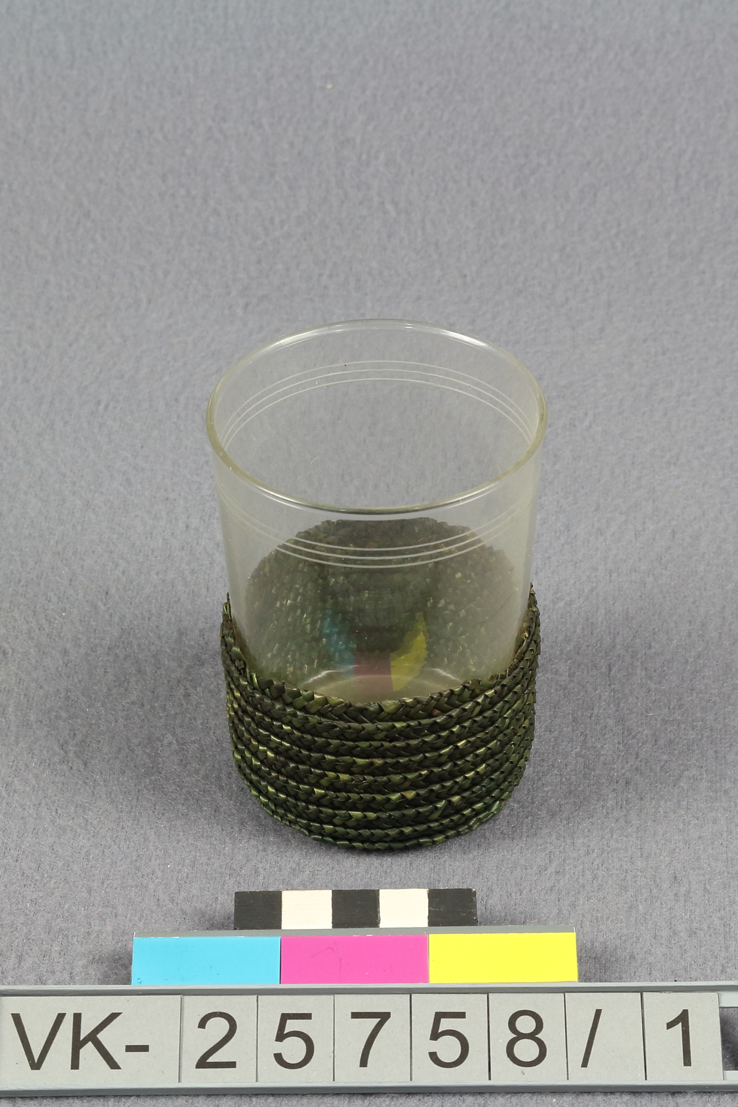 Teeglas, leicht konisch mit drei Zierlinien im Randbereich, im unteren Drittel mit einem grünen Strohgflecht bezogen.