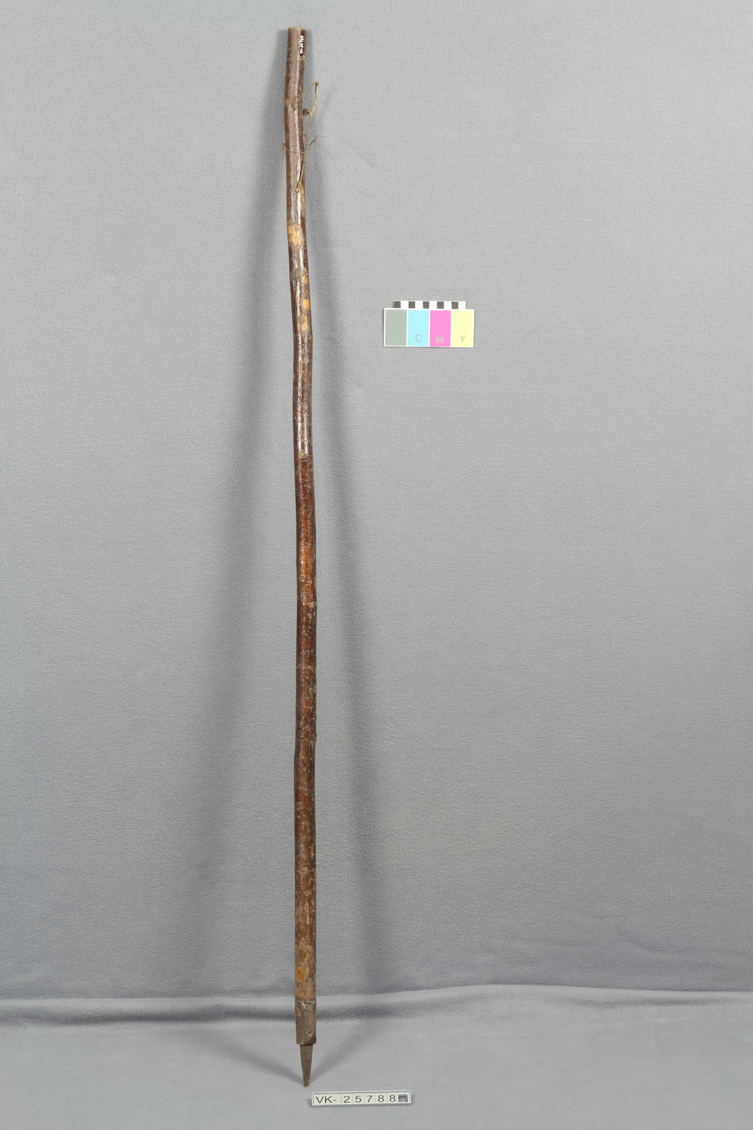 Gerader, nicht entrindeter Ast mit einer Eisenspitze.
