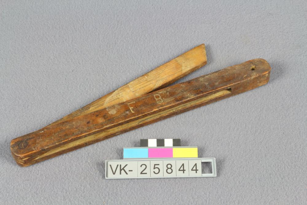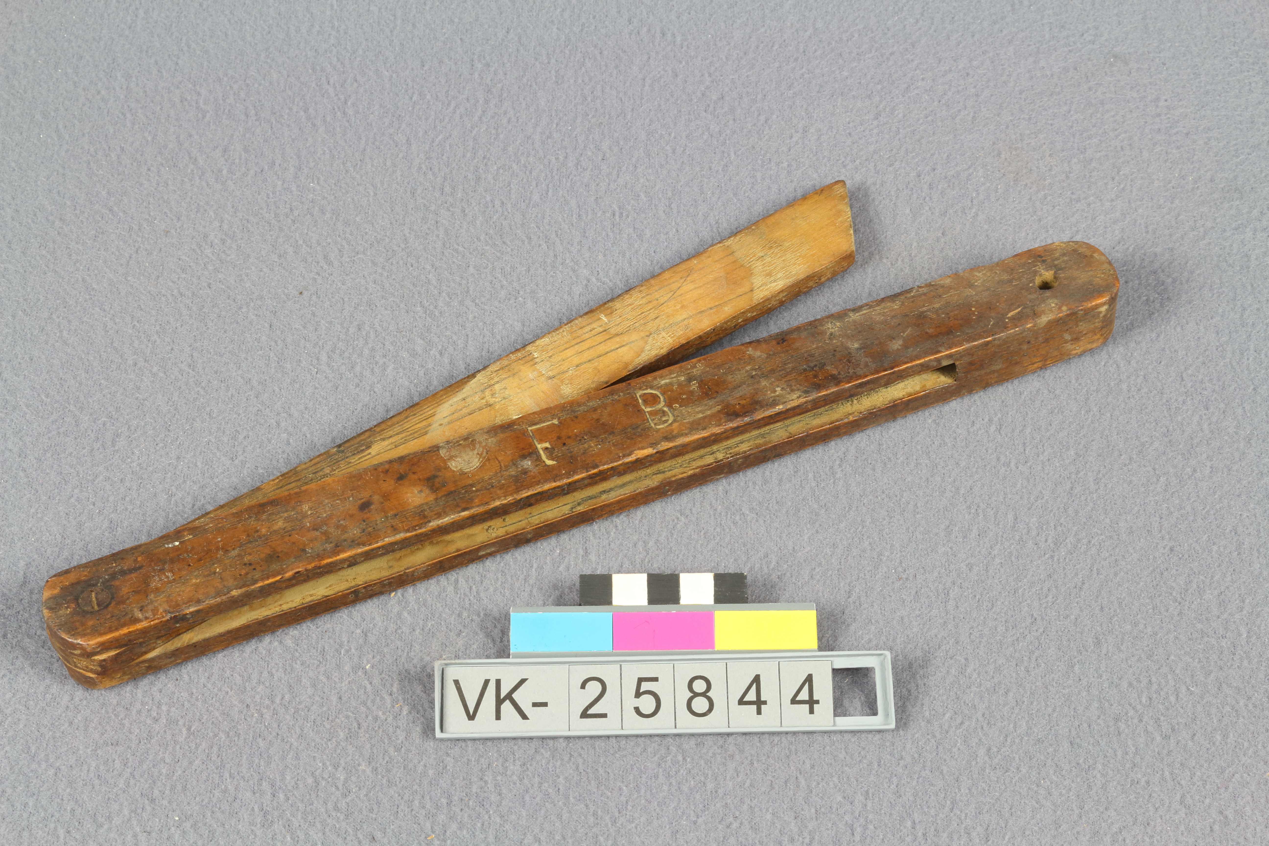 Winkelmaß aus Holz mit klappbarem Element, mit eingeschnittener Beschriftung: "F B".