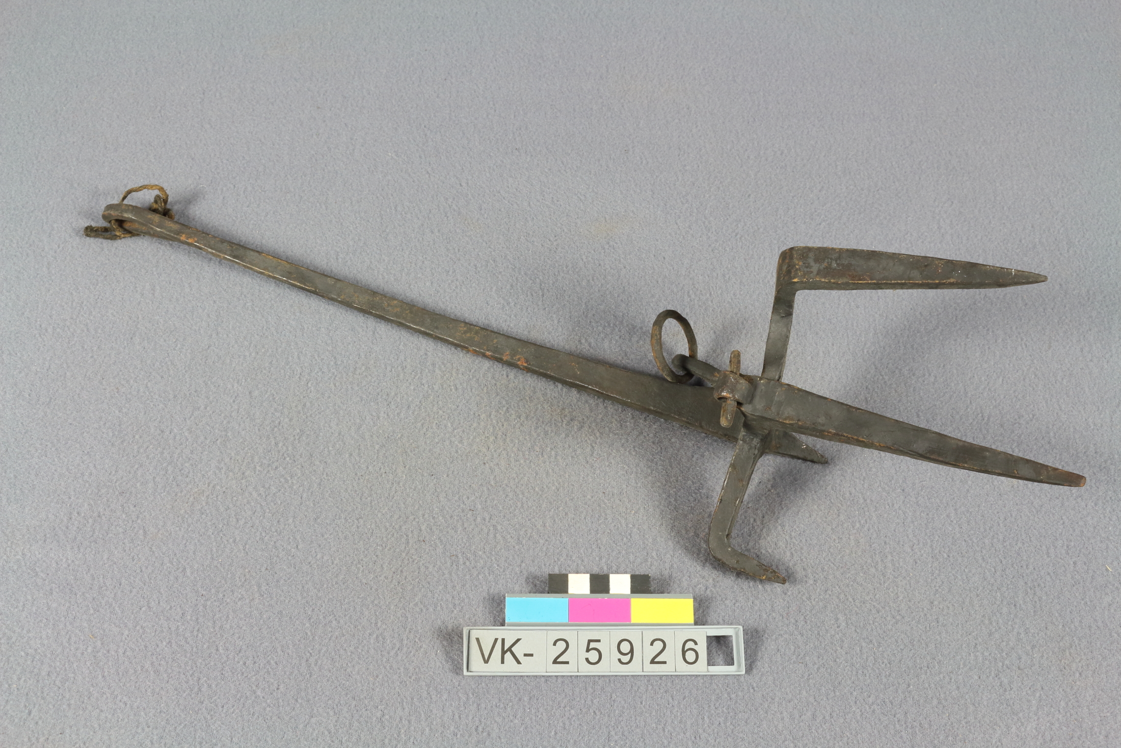 Steighilfe aus Eisen mit scharfen Spitzen und einer langen Stange mit Öse zur Fixierung unter dem Knie. Die Steighilfe dient zum Besteigen von Bäumen.