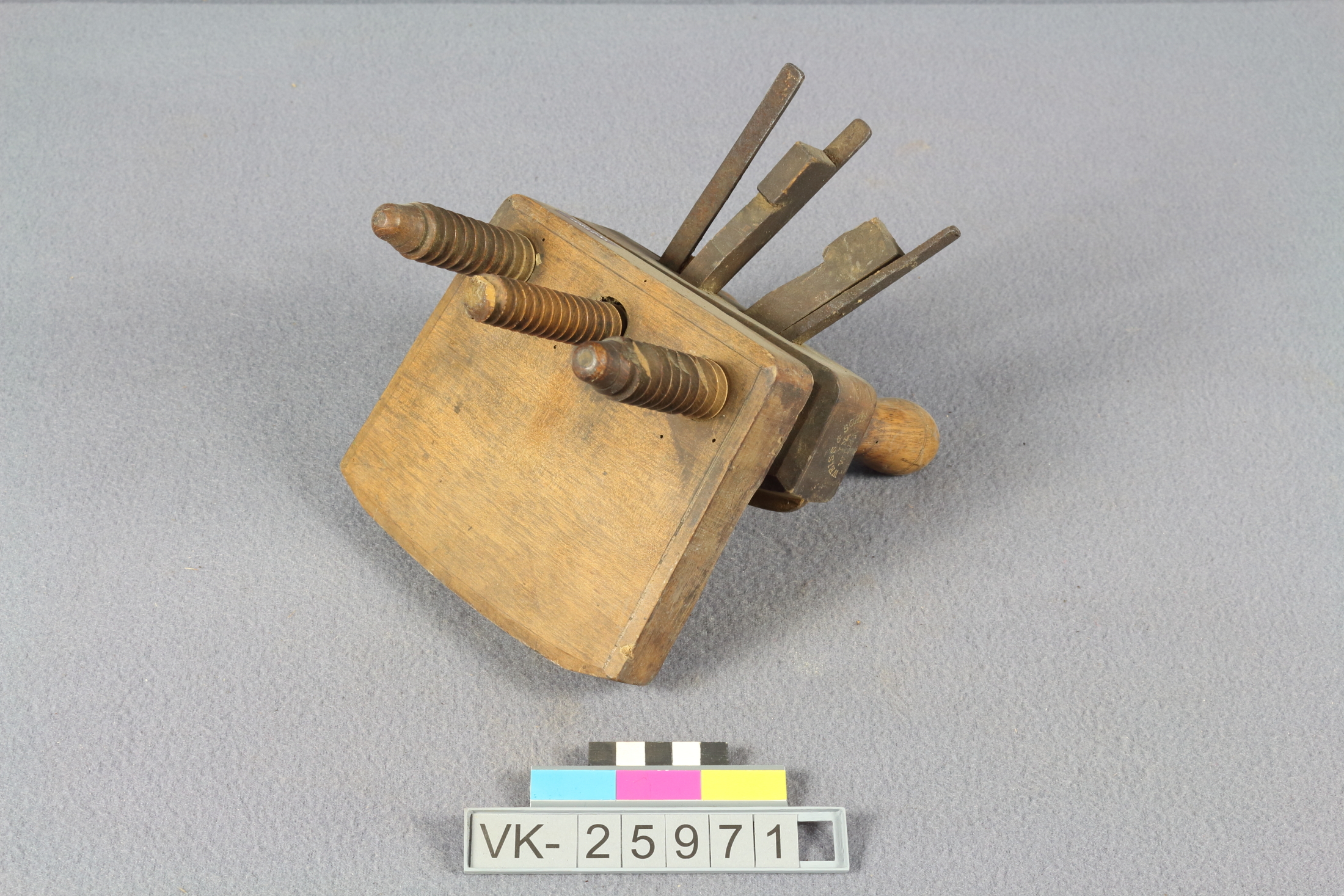 Nuthobel (Kimmhobel) mit drei Gewindestangen und einem schmalen Hobeleisen.