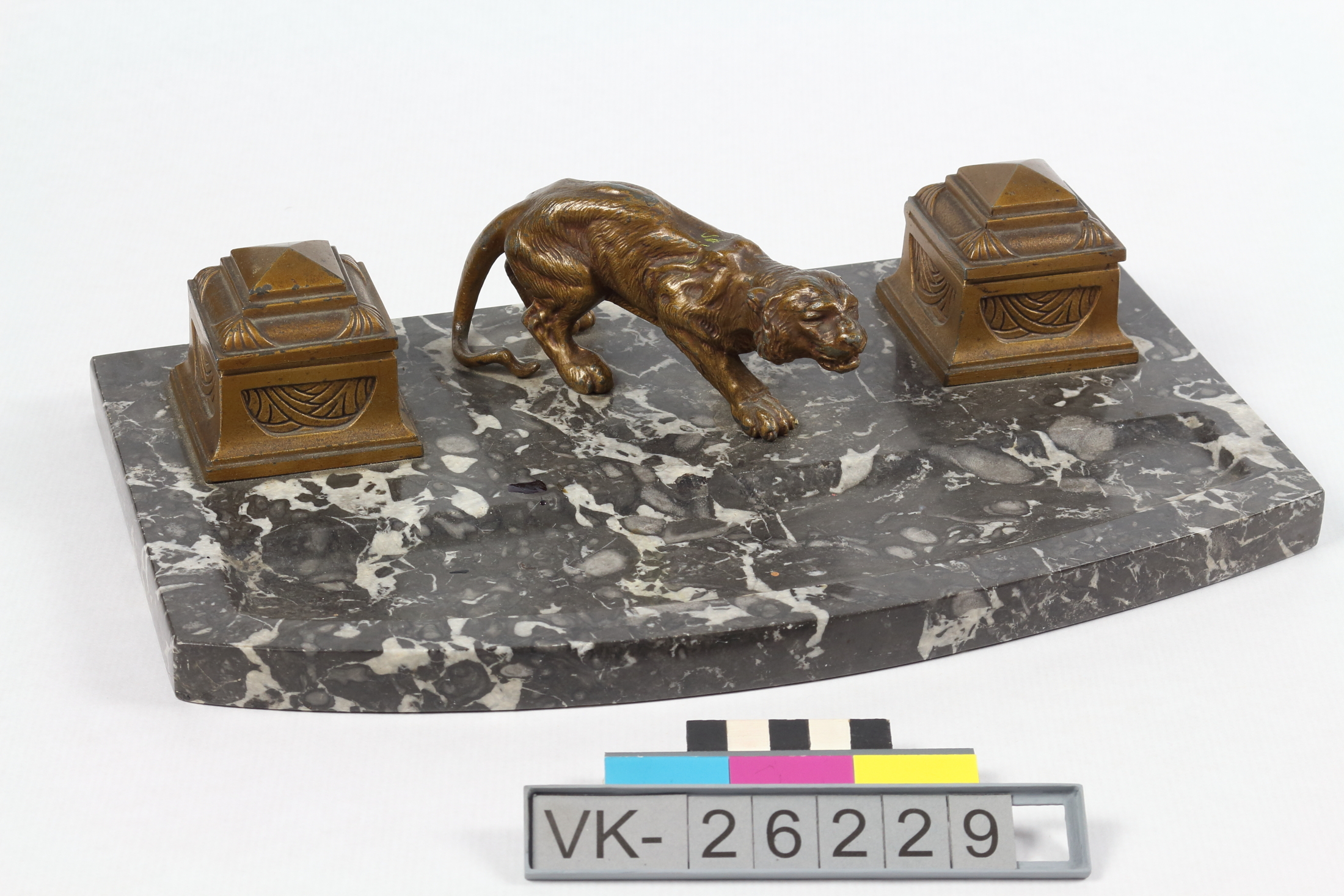 Tintenzeug auf einer Marmorplatte: Zwei Fässchen in Bronzesockeln mit Klappdeckeln, dazwischen eine Großkatze in lauernder Haltung.