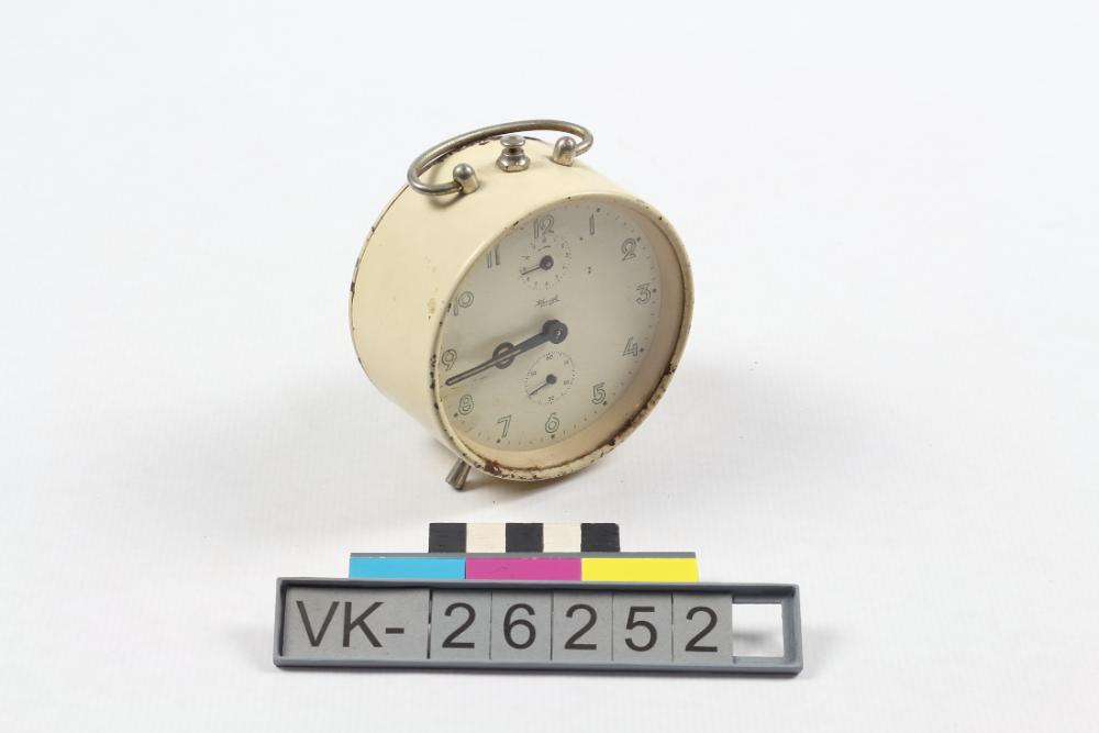 Runder Wecker mit weißem Gehäuse und zwei Füßen. Der Wecker hat ein weißes Zifferblatt und schwarze Zeiger. Zifferblatt und Zeiger sind mit Leuchtfarbe bemalt; es handelt sich um eine radioaktive Farbe (durch das Glas messbar ca. 0,3 µSv/h).