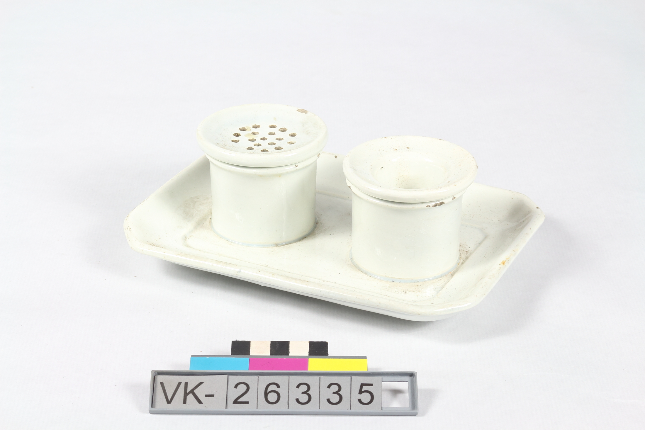 Tintenzeug: Porzellantasse (VK-26335a) mit Einsätzen (VK-26335b und VK-26335c): Tintenfass und Sandstreuer.
