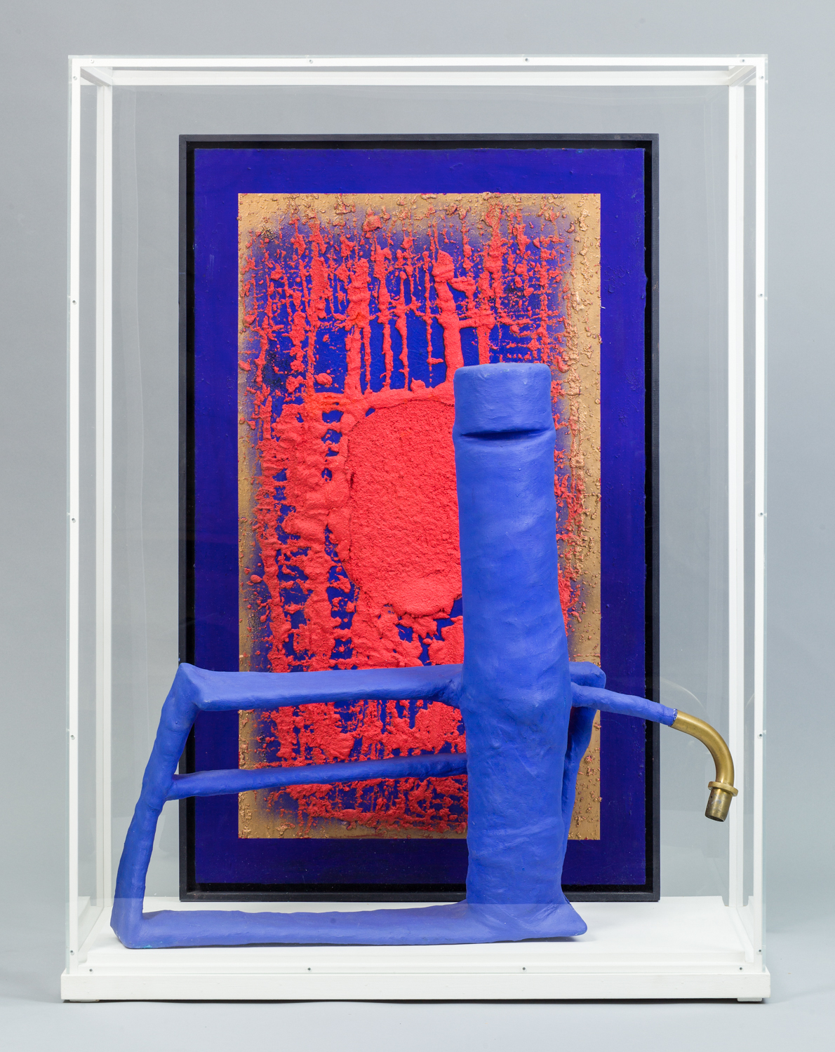 Material/TechnikMischtechnik auf Leinwand, Holzrahmen, Gips (polychromiert), Messing, Holz, Acrylglas