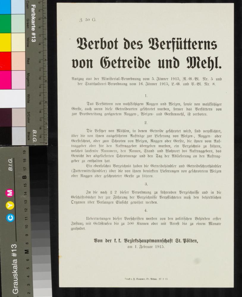 Kundmachung, Verbot des Verfütterns von Getreide und Mehl, 1. Februar 1915, Z. 50 G., k. k. Bezirkshauptmannschaft St. Pölten