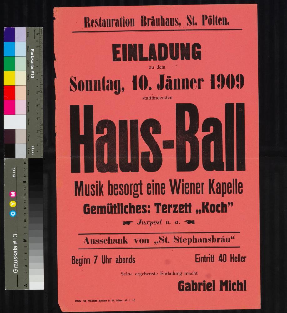 Einladung, Haus-Ball, 10. Jänner 1909, Restauration Bräuhaus, Gabriel Michl, St. Pölten