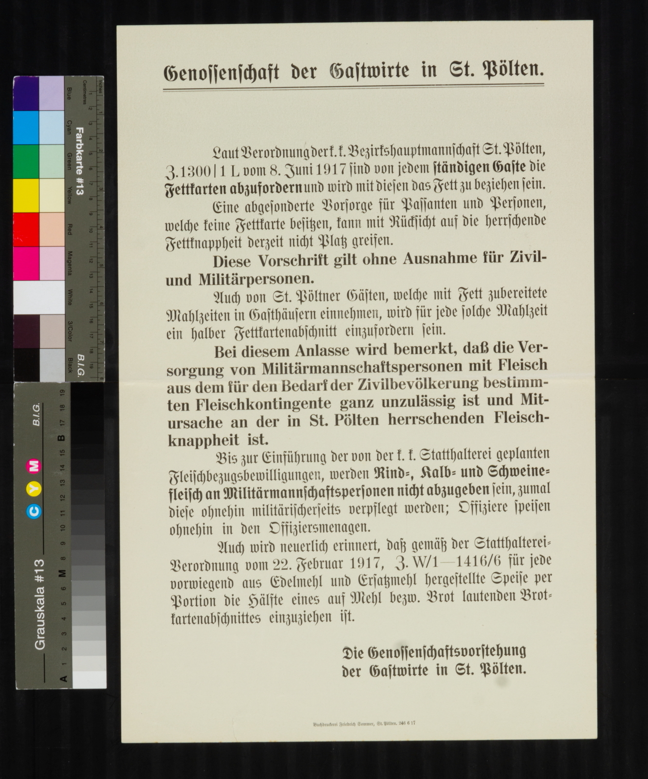 Kundmachung, Genossenschaft der Gastwirte in St. Pölten, Einzug der Fettkarten von jedem Gast eines Gasthauses, 8. Juni 1917, Z. 1300 / 1L, k. k. Bezirkshauptmannschaft St. Pölten
