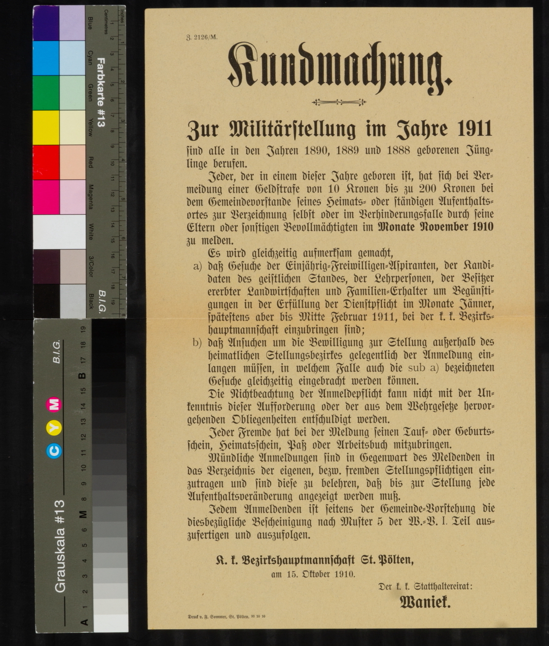 Kundmachung, Zur Militärstellung im Jahre 1911 sind alle in den Jahren 1890, 1889 und 1888 geborenen Jünglinge berufen, 15. Oktober 1910, k. k. Bezirkshauptmannschaft St Pölten
