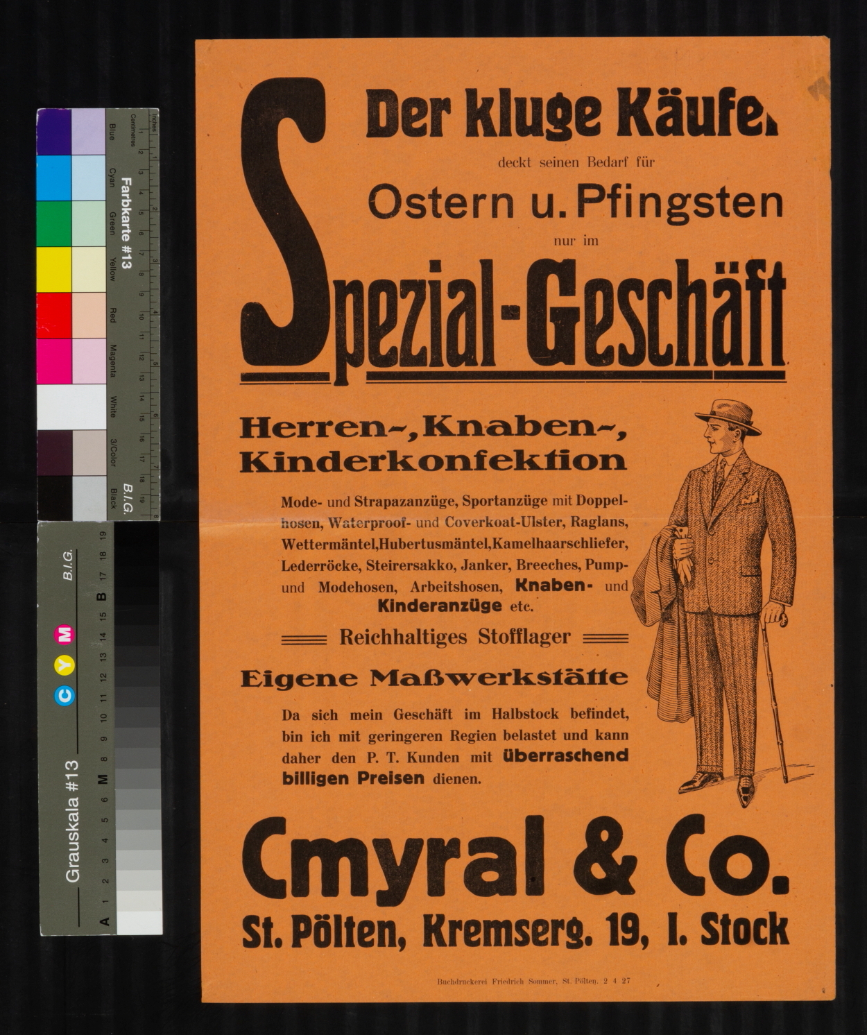 Werbung, Spezialgeschäft für Herren-, Knaben-, Kinderkonfektion, Maßwerkstätte, Cmyral & Co, St. Pölten, Kremsergasse 19, 1. Stock
