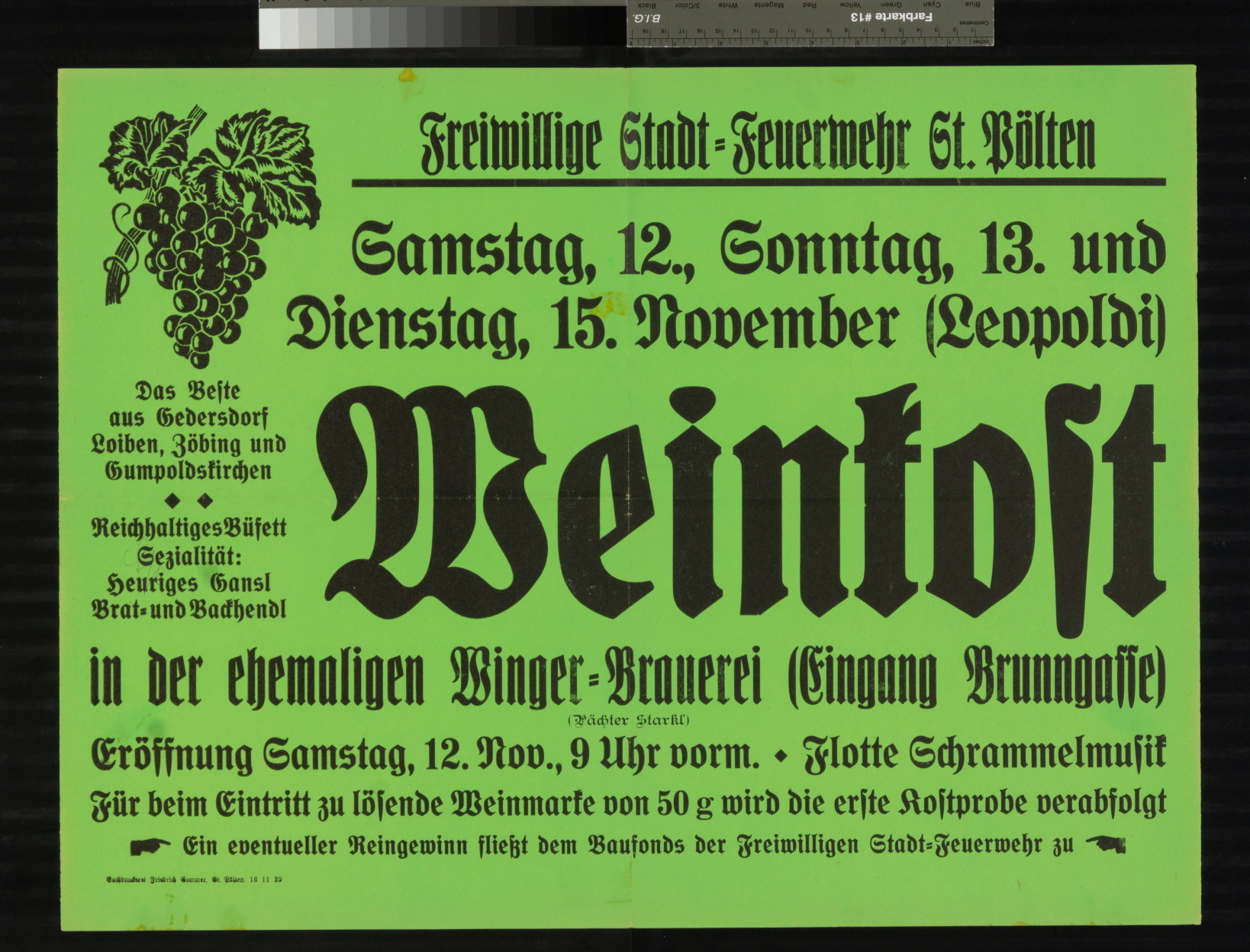 Veranstaltungsankündigung, Weinkost der Freiwilligen Stadt-Feuerwehr St. Pölten, ehemalige Winger-Brauerei (Pächter Starkl), St. Pölten, (Eingang) Brunngasse
