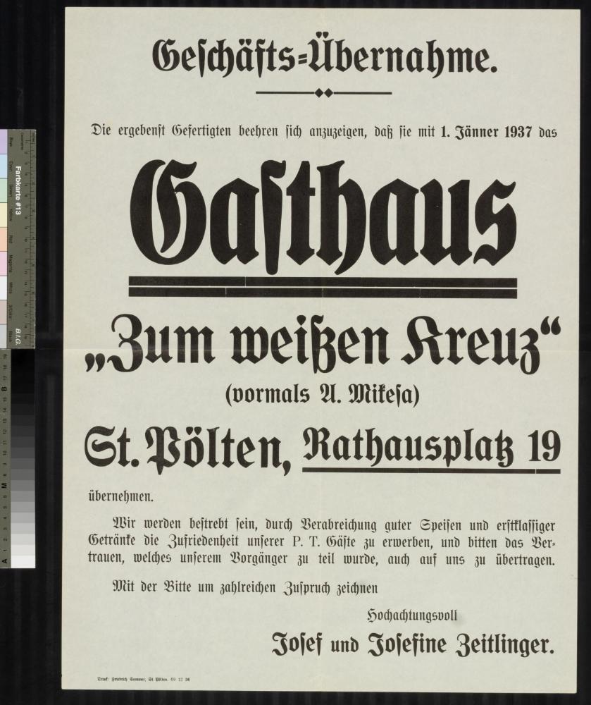 Ankündigung, Geschäftsübernahme des Gasthauses "Zum weißen Kreuz" (vormals A. Mikesa) durch Josef und Josefine Zeitlinger, 1. Jänner 1937, St. Pölten, Rathausplatz 19