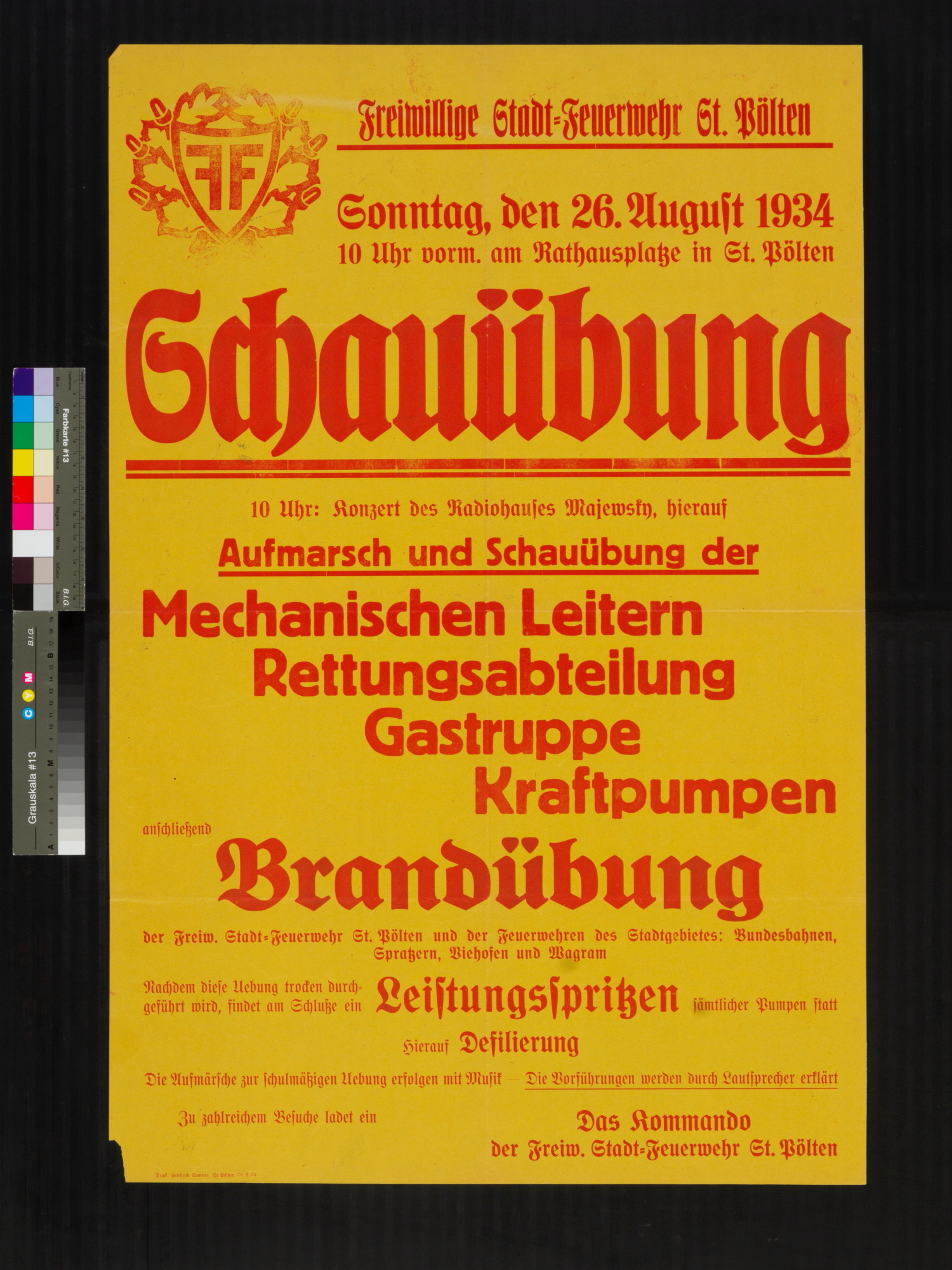 Veranstaltungsankündigung, Freiwillige Stadt - Feuerwehr St. Pölten, Schauübung mit Brandübung und Leistungsspritzen (zusammen mit den Feuerwehren der Bundesbahnen, Spratzern, Viehofen und Wagram), 26. August 1934, St. Pölten, Rathausplatz