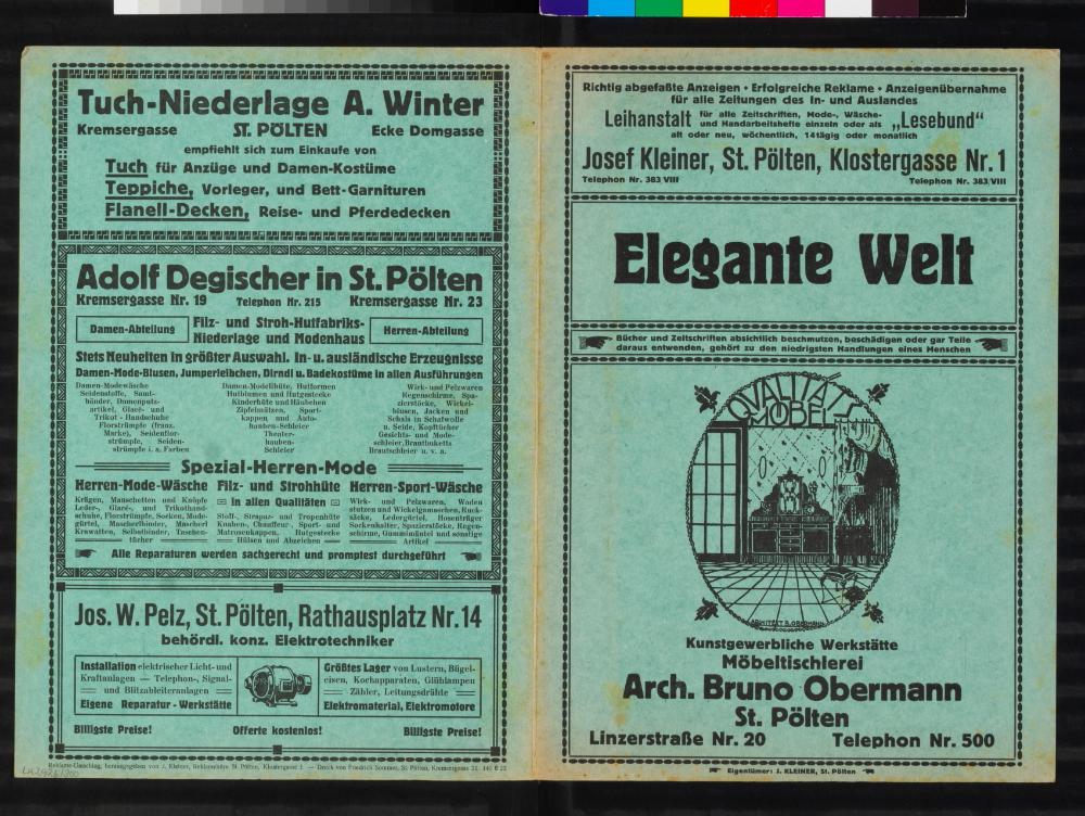 Reklame-Umschlag, Elegante Welt, Juni 1923, Reklamebüro Josef Kleiner, St. Pölten, Klostergasse 1
