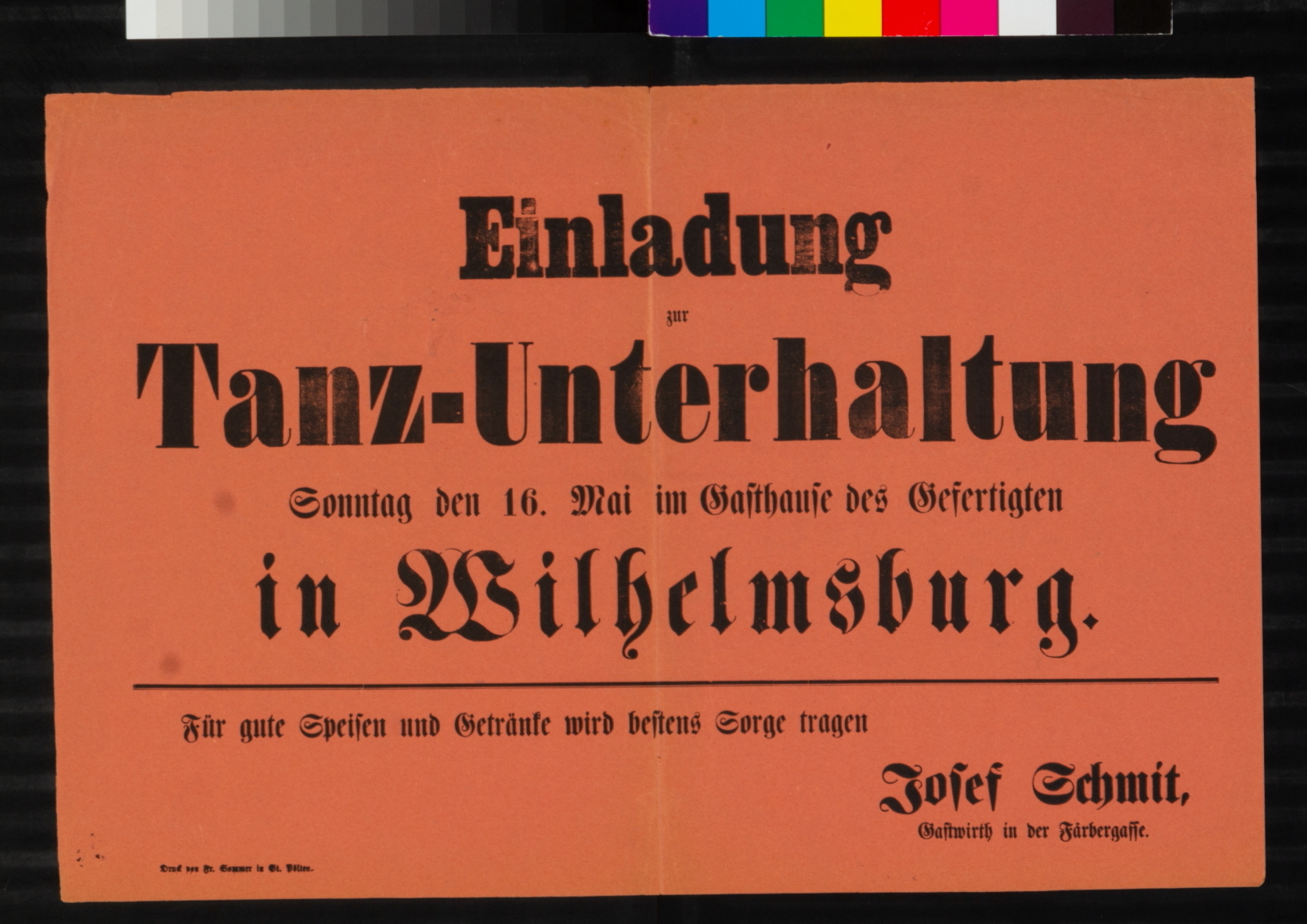 Einladung, Tanzunterhaltung Wilhelmsburg im Gasthaus Josef Schmit, 16. Mai 1886.