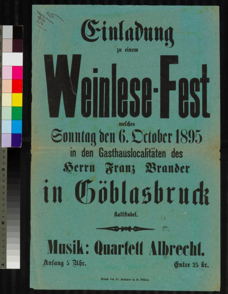 Einladung, Weinlesefest, Gasthaus Franz Brander in Göblasbruck, 6. Oktober 1895.