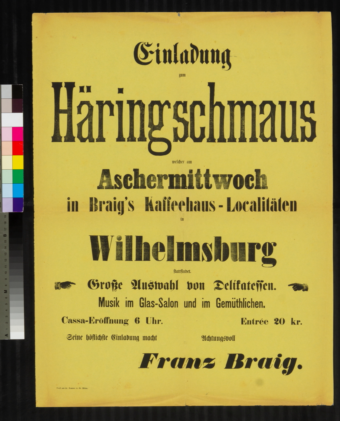 Einladung, Häringsschmaus Aschermittwoch, Kaffeehaus von Franz Braig in Wilhelmsburg, 1885.
