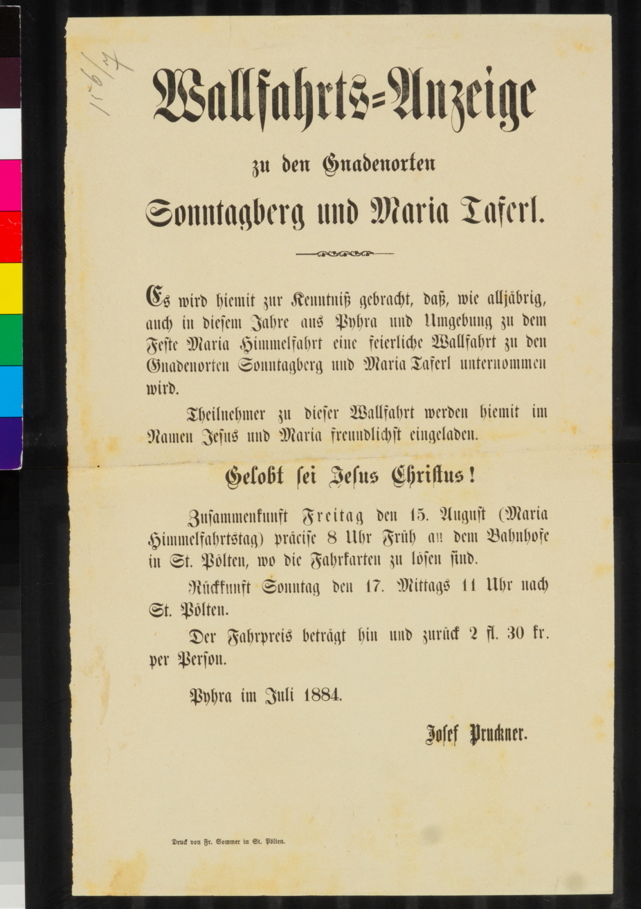 Wallfahrtsanzeige, Gnadenorte Sonntagberg und Maria Taferl, Pyhra, Josef Pruckner, Juli 1884.