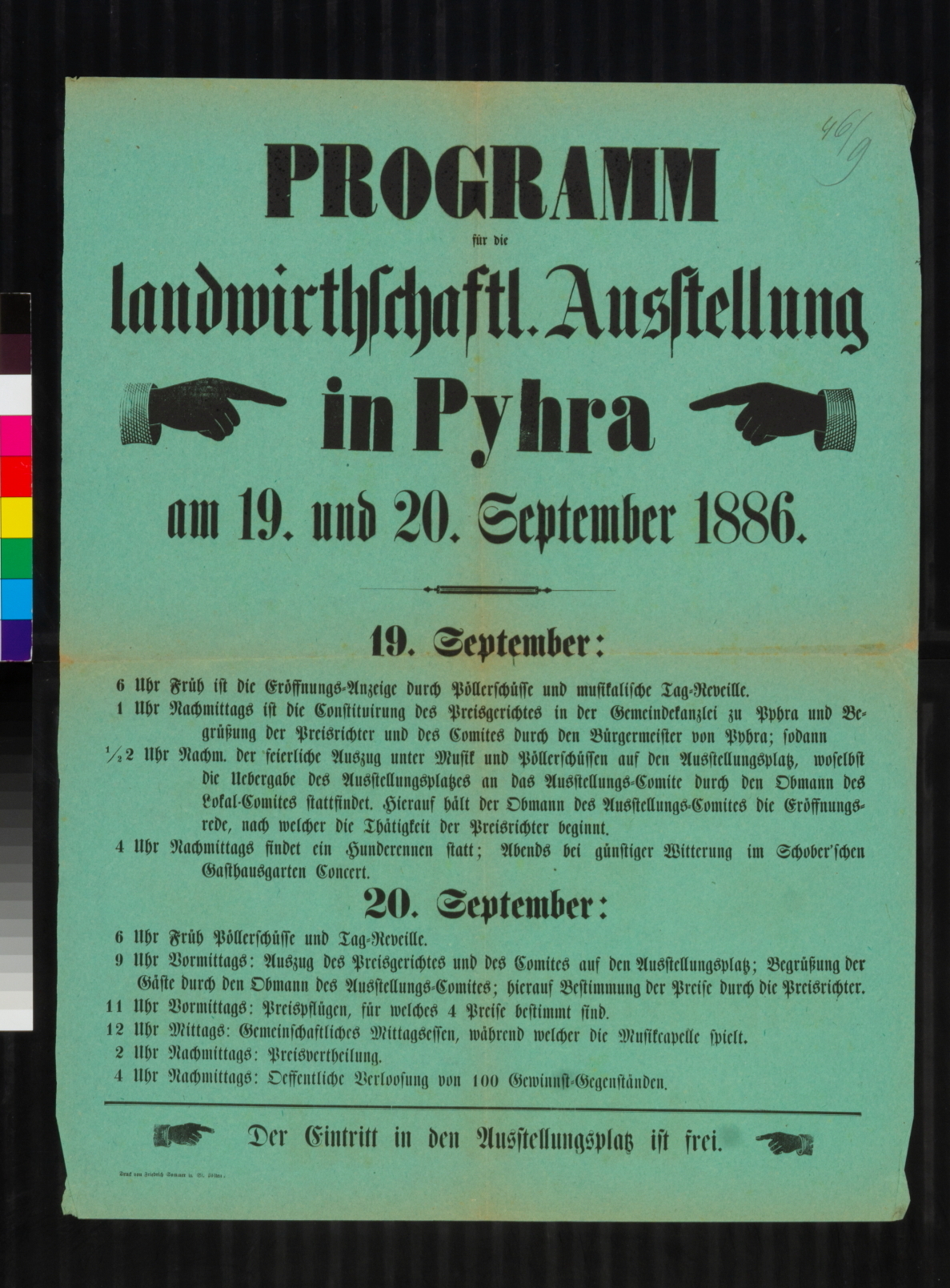 Programm für die landwirtschaftliche Ausstellung in Pyhra, 19. u. 20. September 1886.