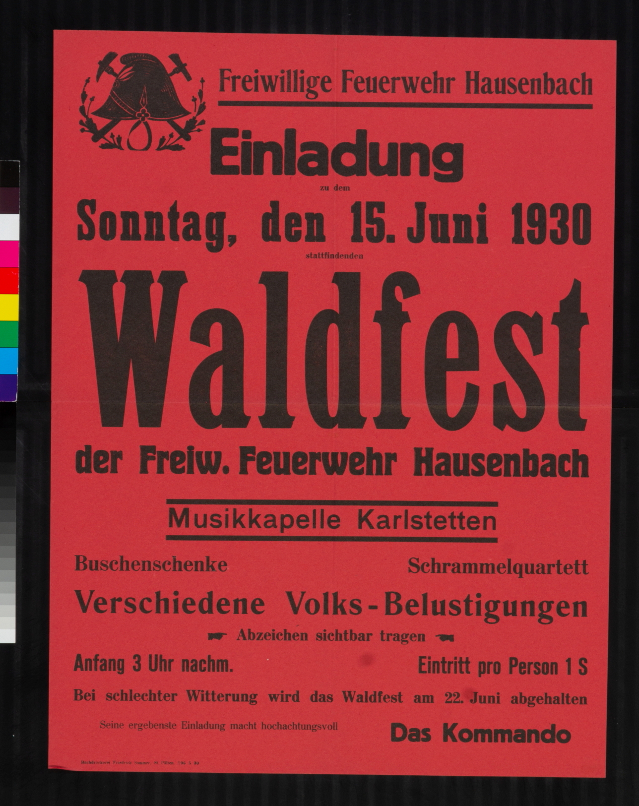 Einladung, Waldfest der freiwilligen Feuerwehr in Hausenbach, Musikkapelle Karlstetten, 15. Juni 1930.