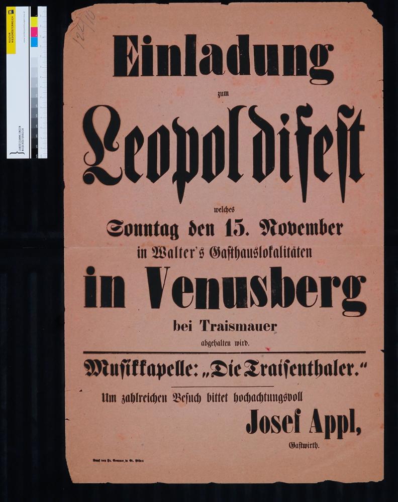 Einladung, Zum Leopoldifest in Venusberg bei Traismauer, Gasthaus Josef Appl, 15. November 1891.