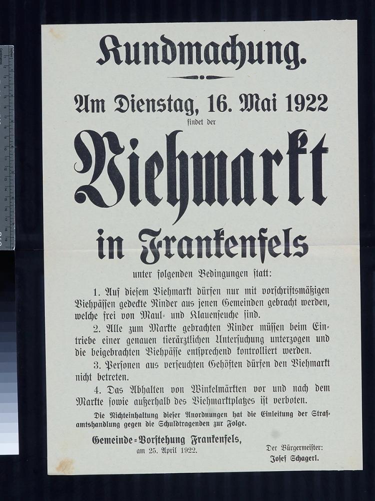 Kundmachung, Viehmarkt in Frankenfels, 16. Mai 1922.