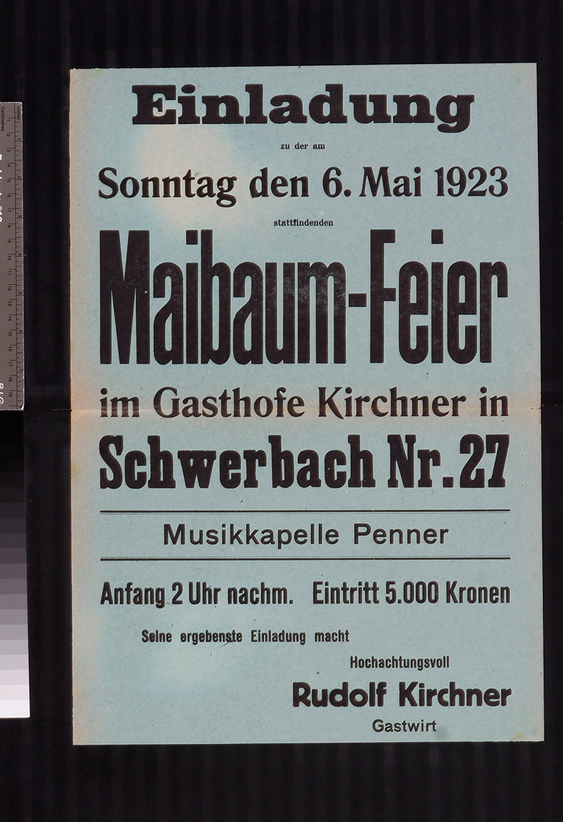 Einladung, Maibaumfeier im Gasthof Kirchner in Schwerbach Nr. 27, Kirchberg an der Pielach, 6. Mai 1923.
